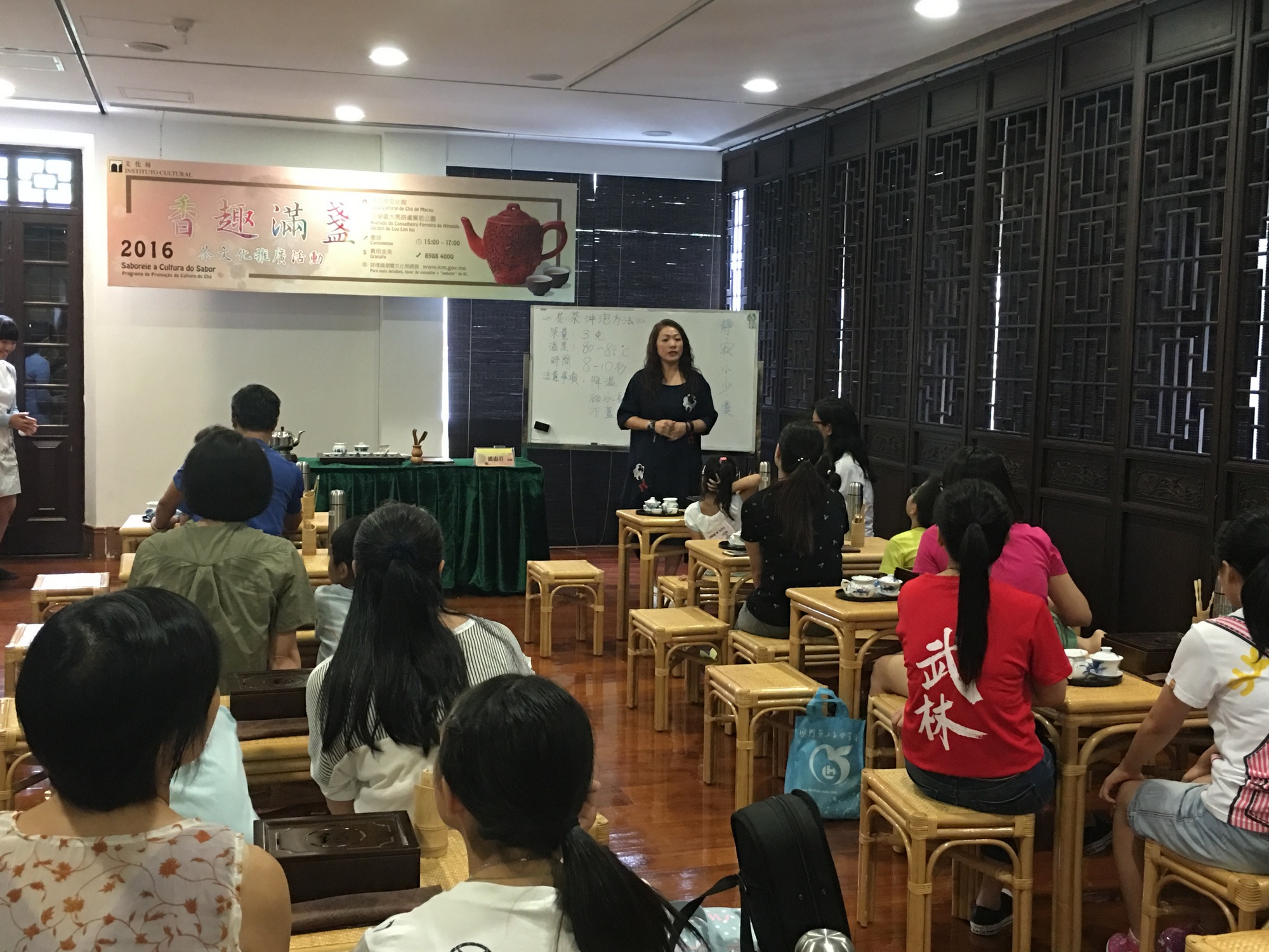 “親子茶藝工作坊”由澳門茶藝協會資深茶藝導師潘惠芬,以輕鬆活潑的方式介紹中國茶葉種類、製造方法、特性和茶具使用方法,藉此啓發兒童和家長的感官,引導參加者運用視覺、嗅覺、味覺和心靈來欣賞茶湯之色、香、味、形,並教授基本泡茶工藝及奉茶禮儀。是次參加的家庭中的小童成員的年齡層橫跨四歲至十五歲,為更好地照顧到每一位參加者的需要,除導師外,澳門茶藝協會亦安排了多位少年茶藝師到現場作協調,親身指導小童完成整個泡茶及奉茶過程。