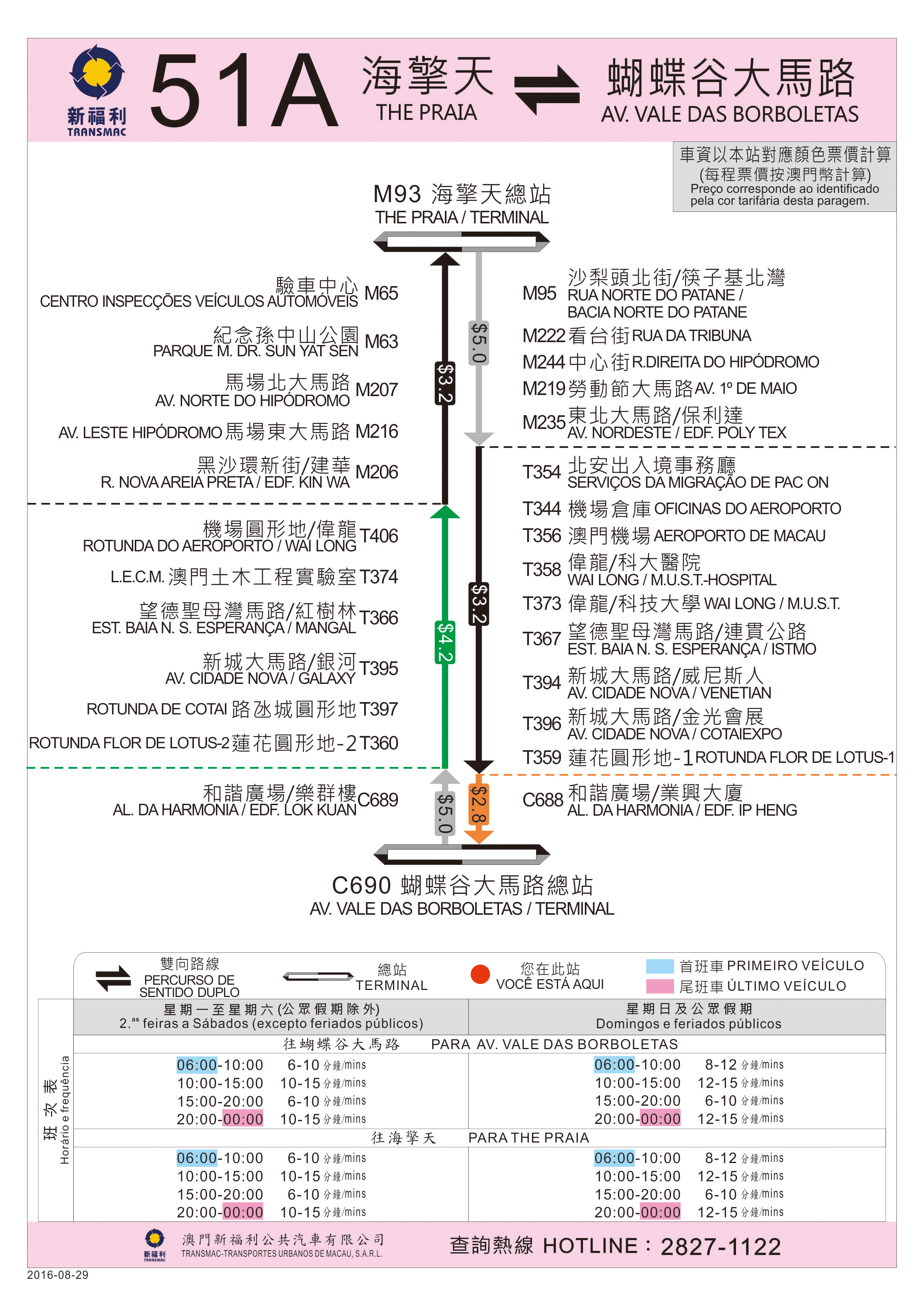 為進一步強化澳門北區至路氹城及石排灣之公交服務,交通事務局由8月29日(周一)起開通51A路線,連接筷子基林茂塘、祐漢至路氹城及石排灣,並以新設置的位於筷子基的“海擎天"及石排灣的“蝴蝶谷大馬路"巴士站為總站;此外,將調配30路線的資源開闢30X快速路線,加快疏導關閘至氹仔舊城區的乘客。