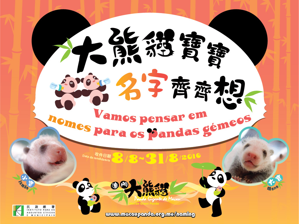 民政總署舉辦的“大熊貓寶寶名字齊齊想”活動將於八月三十一日結束。民署呼籲市民把握時間,為一對雄性雙胞胎大熊貓寶寶建議有良好寓意的名字,最終獲選的名稱更可以成為日後大熊貓寶寶正式的名字,同時合資格參加者更可以參加抽獎。歡迎市民登入澳門大熊貓網或索取表格參加。