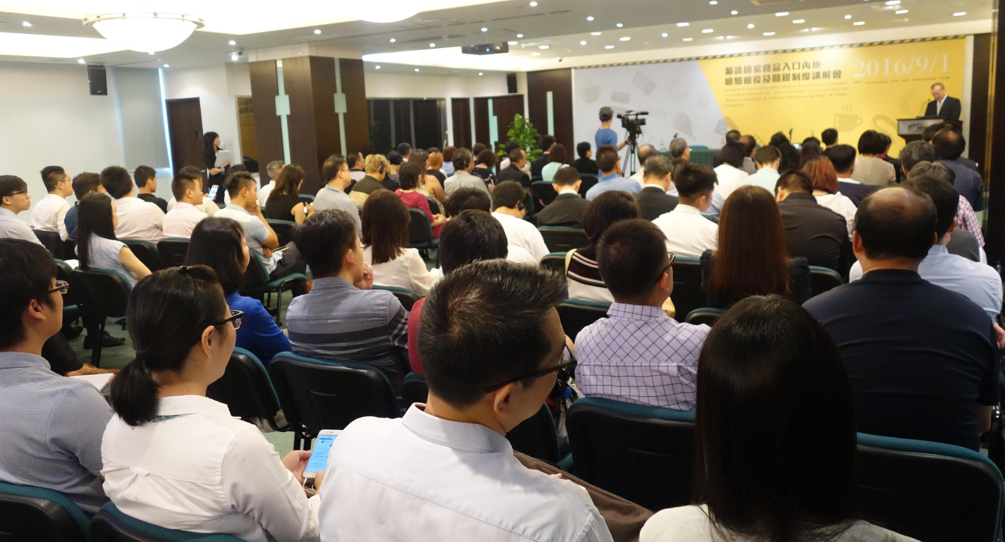 為使業界更清晰葡語國家食品透過澳門入口至中國內地的檢驗檢疫、通關及關稅方面的手續及流程,由澳門特別行政區海關、經濟局、財政局、澳門貿易投資促進局及民政總署代表組成的“葡語國家食品集散中心跨部門工作小組”今(1)日及明日舉辦 “葡語國家食品入口內地檢驗檢疫及關稅制度”講解會暨考察活動。活動首日舉辦講解會,反應熱烈,吸引過百名有意或已從事代理葡語國家食品的企業家及相關人士參與。