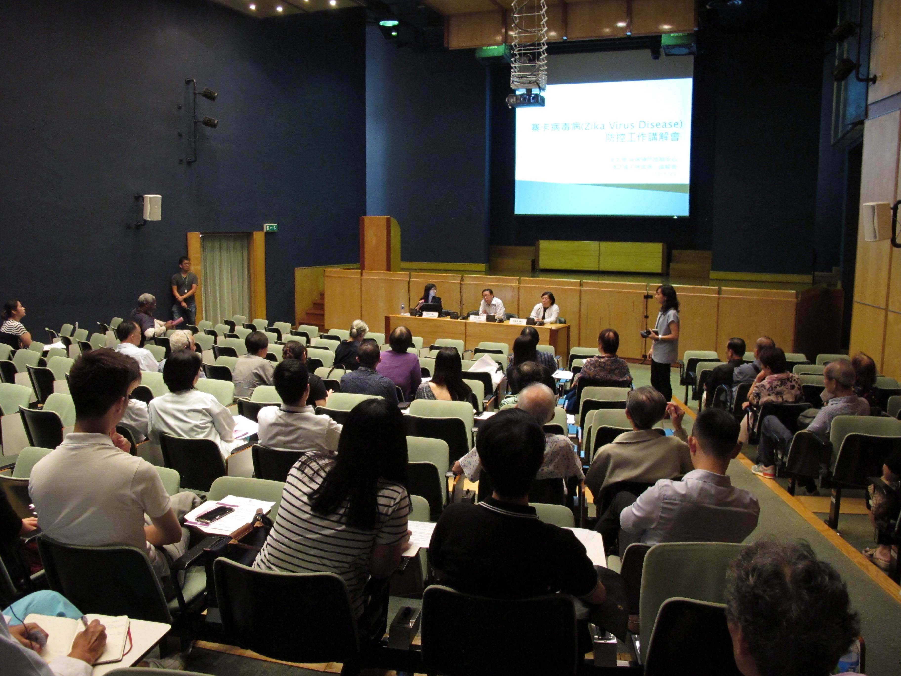 為提高前線醫務人員對寨卡病毒病的警覺性及相關認識,加強應對能力,衛生局於今日(9月2日)下午在衛生局大禮堂再次為全澳私人執業醫務人員及衛生局醫務人員舉行一場「預防寨卡病毒病」講解會,由疾病預防控制中心傳染病防制暨疾病監測部協調員梁亦好醫生主講,疾病預防控制中心主任林松醫生及仁伯爵綜合醫院婦產科主任唐蘊瑩醫生出席答問環節。