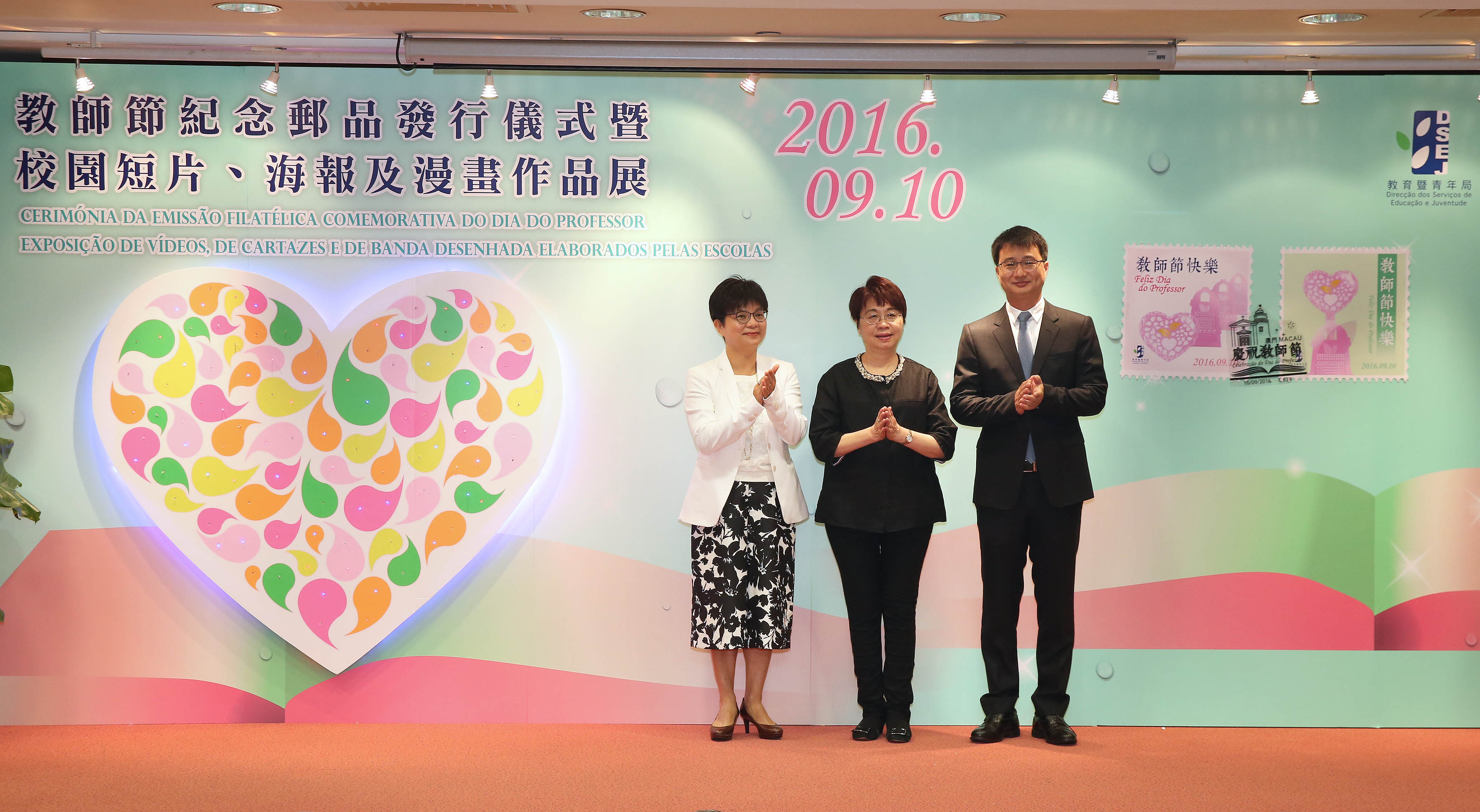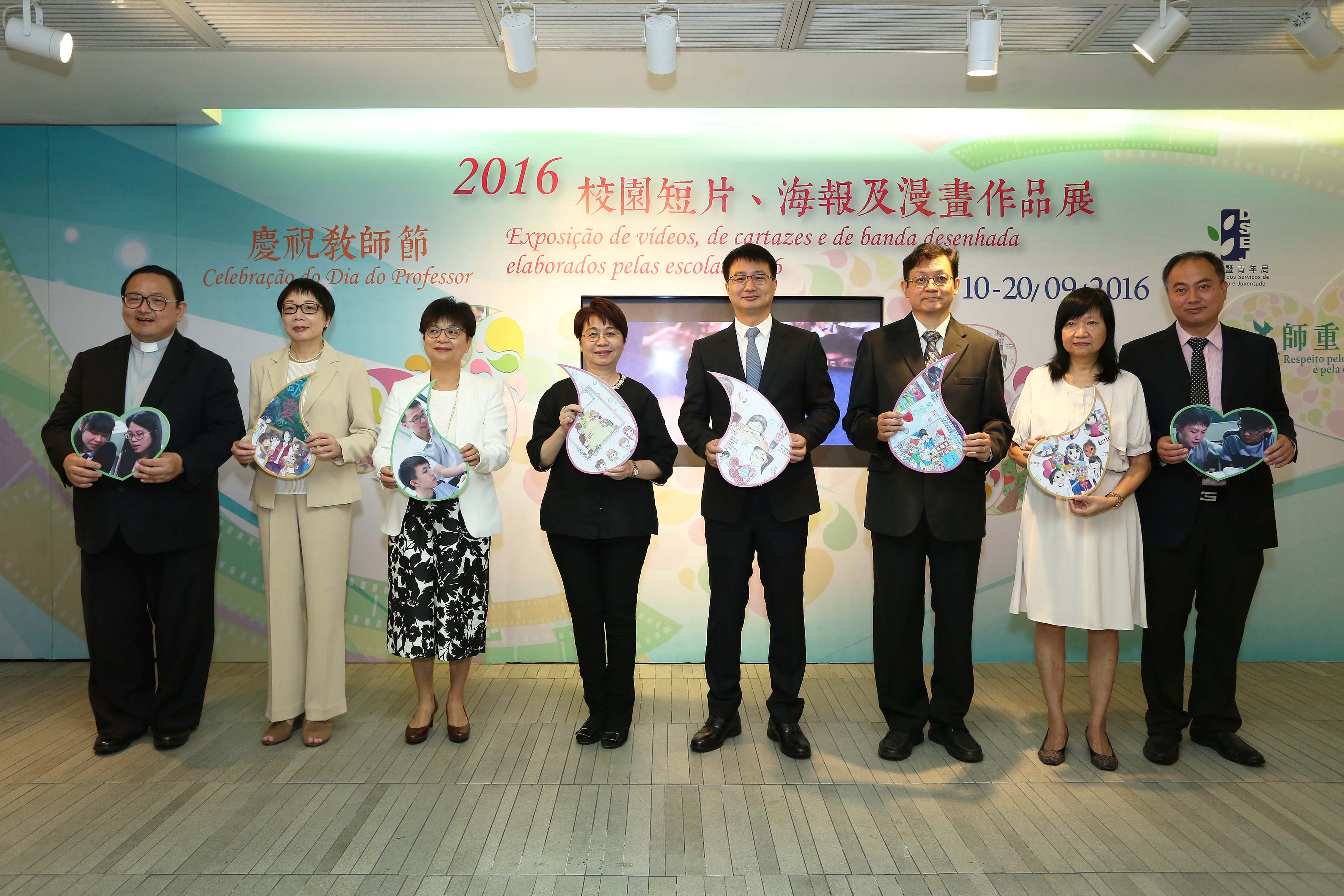 教育暨青年局今年繼續與郵政局合作發行教師節紀念郵品,並舉辦校園短片、海報及漫畫創作比賽,作為慶祝教師節的核心活動。同時,9月10日上午在教青局仲尼堂舉行2016紀念郵品發行儀式,在教育資源中心子瞻廊舉行2016校園短片、海報及漫畫作品展開幕禮。教青局局長梁勵、郵政局局長劉惠明、中央人民政府駐澳門特別行政區聯絡辦公室文化教育部副部長浦海龍、教青局副局長老柏生及郭小麗、澳門中華教育會會長何少金、澳門天主教學校聯會會長周伯輝、澳門公職教育協會理事長劉文堯,以及教育發展基金委員、非高等教育委員會委員、青年事務委員會委員、教學人員專業委員會委員及學校代表等出席了發行儀式及開幕禮。