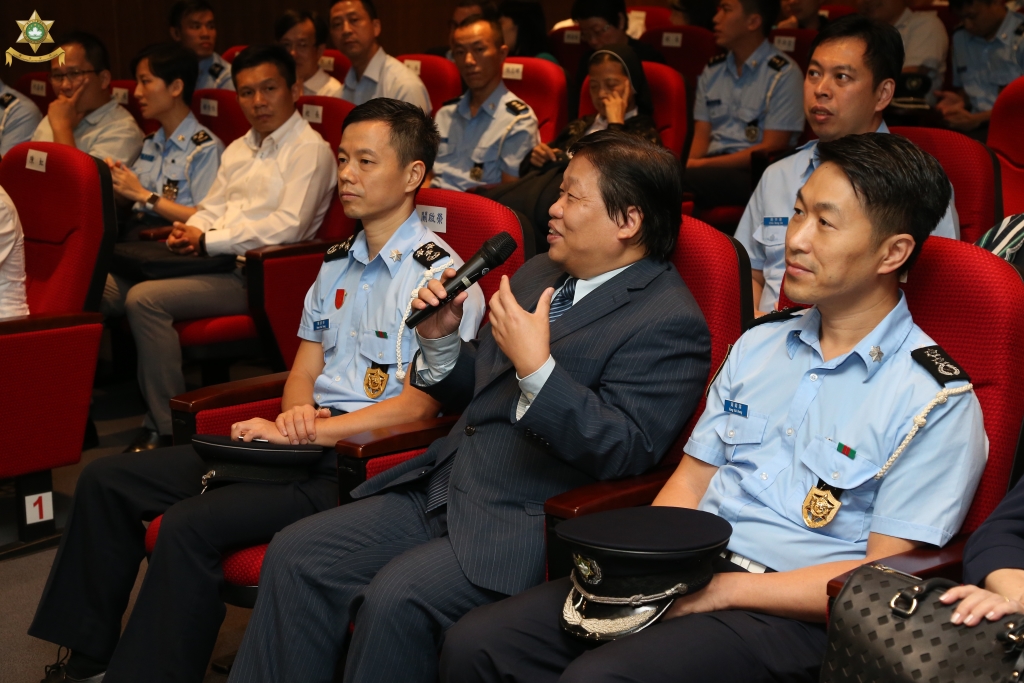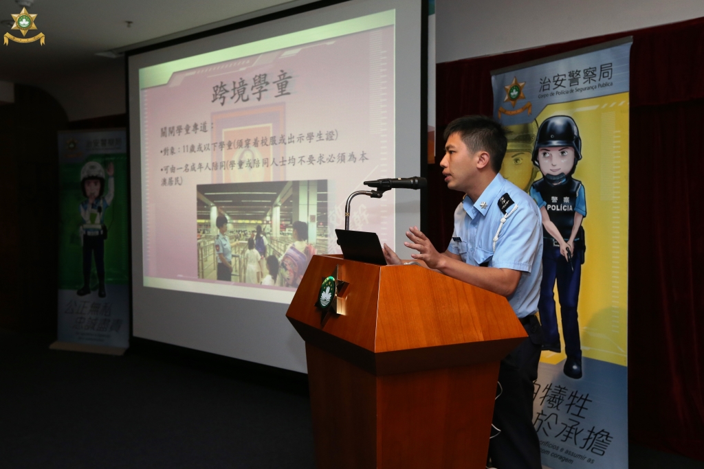 關啓榮代副局長致辭時表示,治安警察局一向重視全澳學生的健康發展,當中預防校園犯罪為治安警察局的重點工作,要解決校園犯罪問題,必須從教育、輔導及預防工作上着手,而家庭、學校及警方三方相互配合才可事半功倍。治安警察局積極與各間學校保持緊密聯繫和合作,恆常派遣警官拜訪各間學校與校方互通警情,將與學生有關的犯罪訊息及最新的防罪資訊傳遞給學校,並聽取校方有關校內及學校周邊範圍的治安訴求,制定針對性的打擊犯罪措施。另外亦於校園內外推廣防罪宣傳教育工作,因應不同年齡層的學生舉辦各種不同主題的防罪教育講座或活動,向學生灌輸防罪滅罪及守法意識。校方亦一直積極配合警方開展相關工作,盼望日後雙方繼續保持密切溝通和合作。