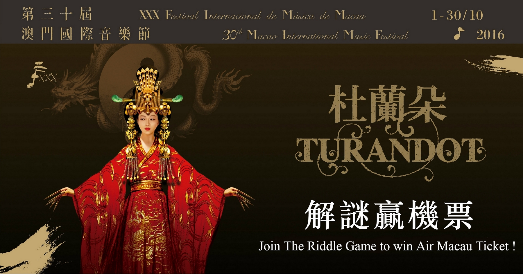 文化局第三十屆澳門國際音樂節為回饋樂迷多年來的鼎力支持,特別推出《杜蘭朵》有獎問答遊戲“公主招親!解謎勇士召喚”及 “全城尋愛” 抽獎活動,奬品豐富,歡迎市民踴躍參加。