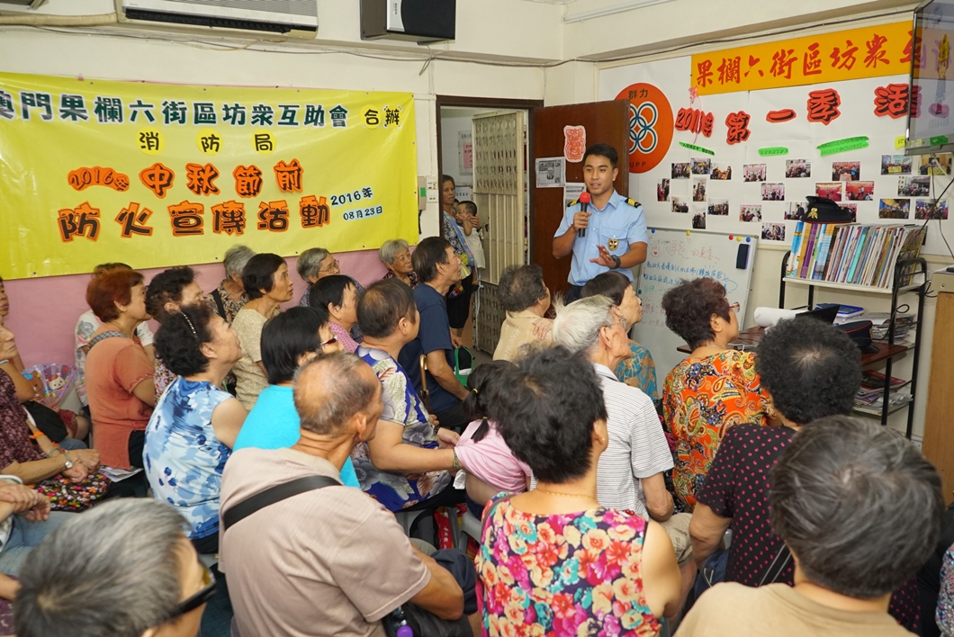 防火宣傳活動於本年8月23日至9月15日期間進行,於大堂區及嘉模堂區一帶區域,向居民派發宣傳單張及海報;此外,消防局亦於8月23日派出消防局官員拜訪“澳門果欄六街區坊眾互助會”,座談中雙方就該區的防火、滅火及救援等工作進行討論並交換意見;而於8月23日及9月1日更分別為“澳門果欄六街區坊眾互助會”及“新口岸區坊眾聯誼會”之會員各開辦一場防火及救護知識講座,並得到坊會義工的協助在區內一帶派發防火宣傳品。