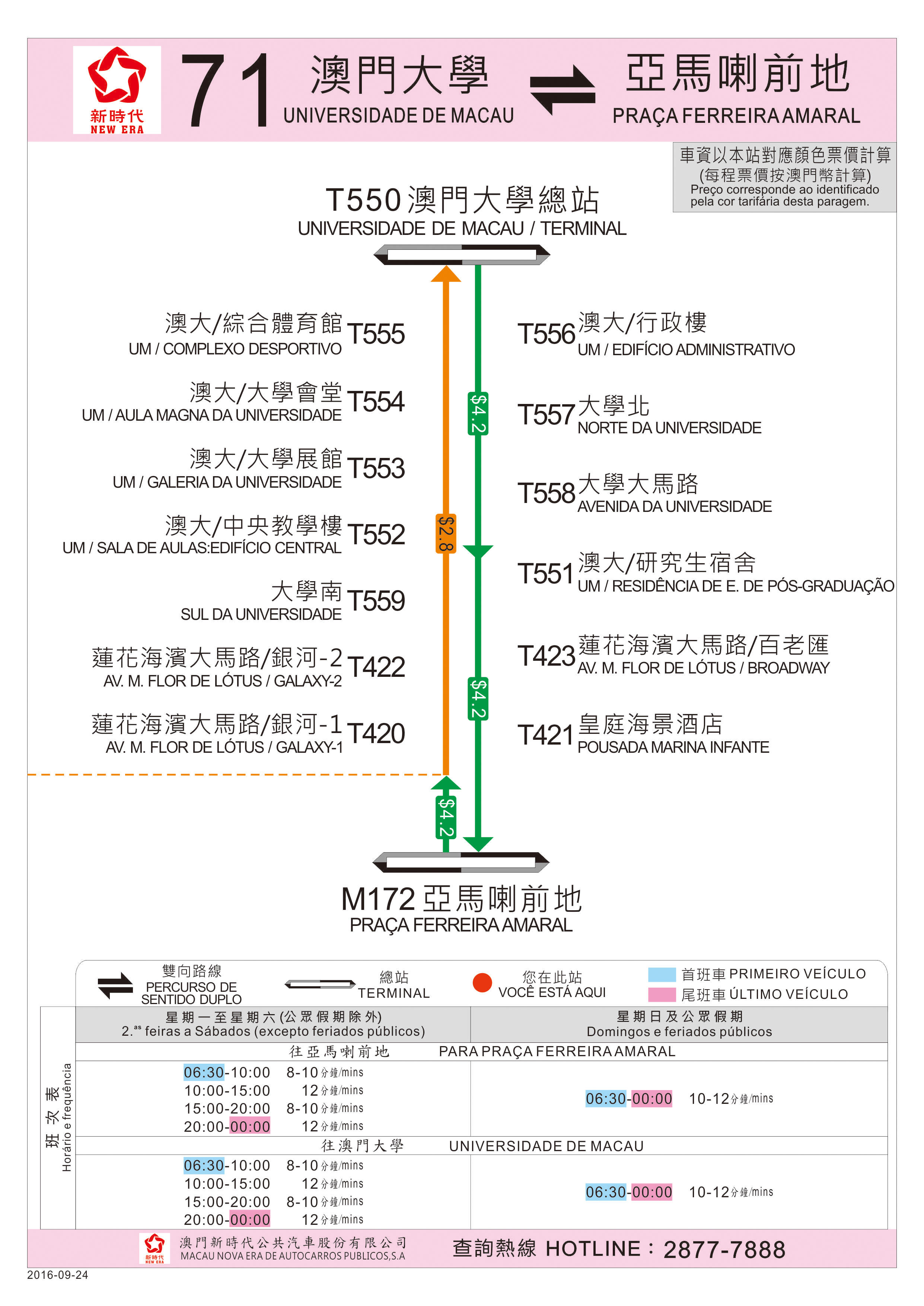 因應路氹城及新區之發展,為提升巴士的接駁能力並明確巴士站位置,交通事務局由9月24日(周六)起調整相關巴士服務及更改部分巴士站名;其中71路線往亞馬喇前地方向會增停靠“蓮花海濱大馬路/百老匯"站及“皇庭海景酒店"站,往澳大方向則增停靠“蓮花海濱大馬路/銀河-1"站及“蓮花海濱大馬路/銀河-2"站,以方便澳大學生及有需要往返該區的市民和遊客搭乘。