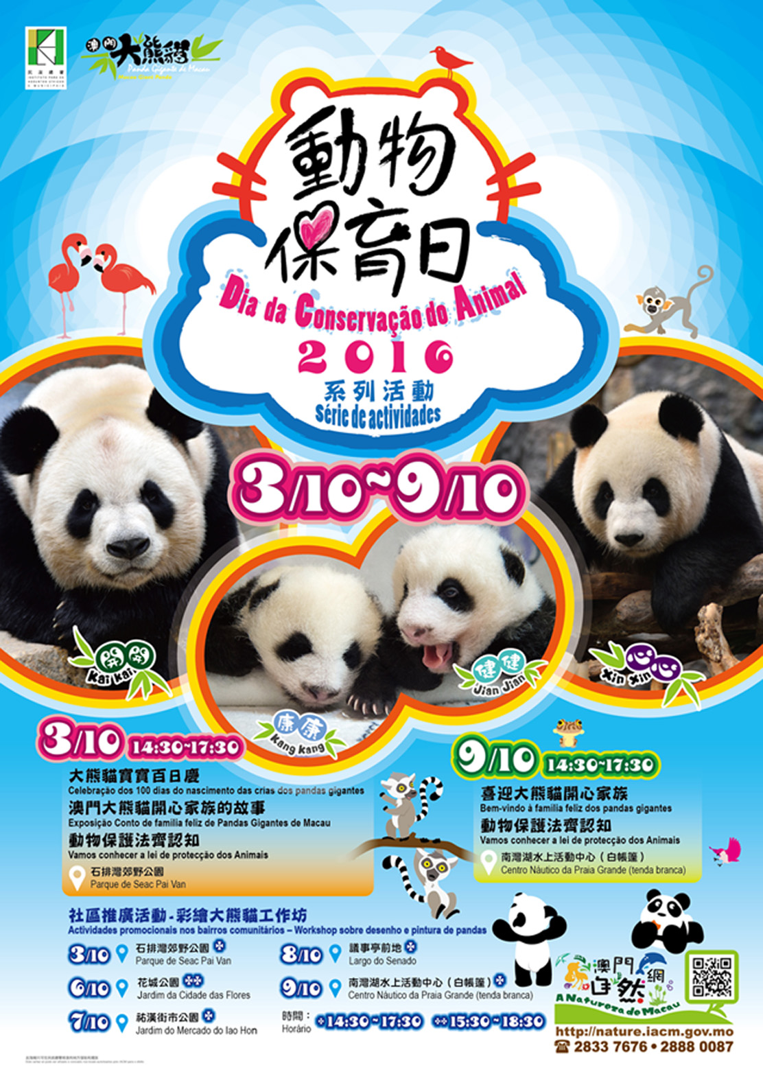 另外,成功報名於十月三日參加“彩繪大熊貓工作坊"的市民,可乘專車前往石排灣郊野公園,當日下午一時四十五分於澳門八角亭開車,中途可在氹仔茵景園巴士站上車,如有需要請於報名時登記說明。查詢請致電2833 7676、2888 0087,或瀏覽澳門自然網http://nature.iacm.gov.mo。