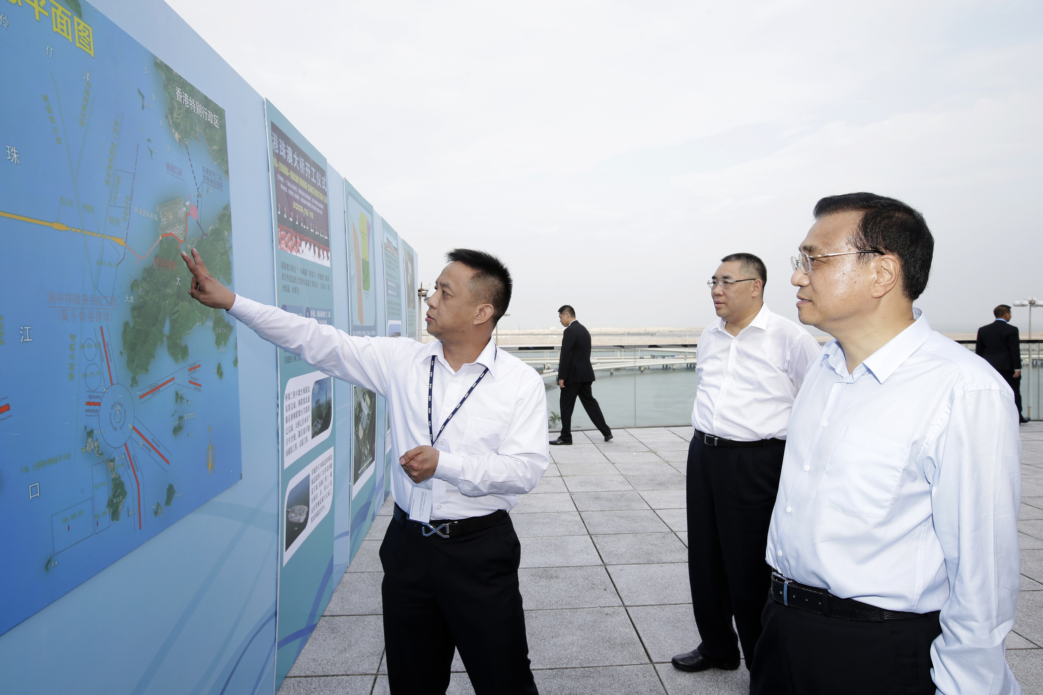 國務院總理李克強在澳門格蘭披治賽車大樓頂層聽取港珠澳大橋建設情況的介紹