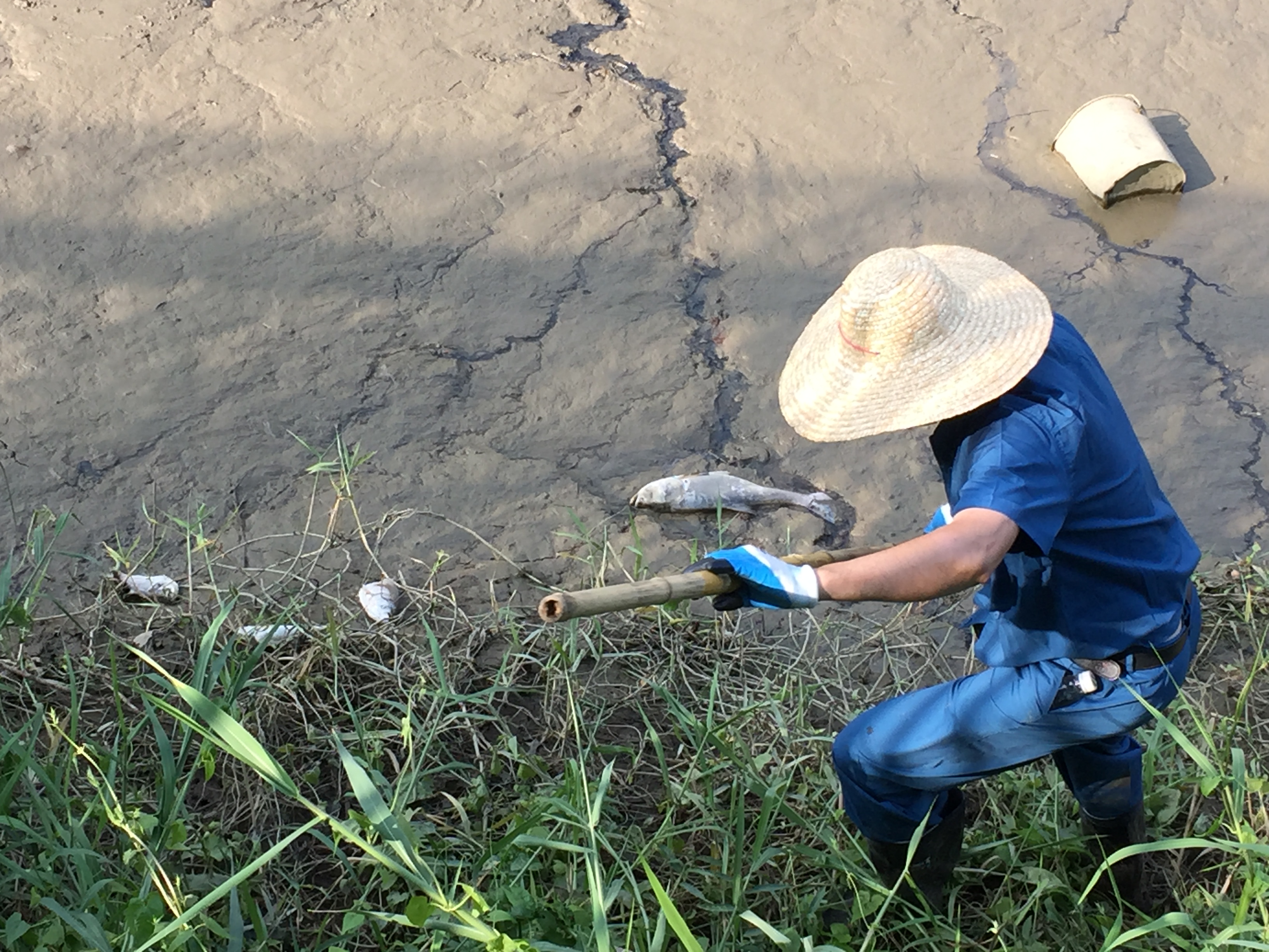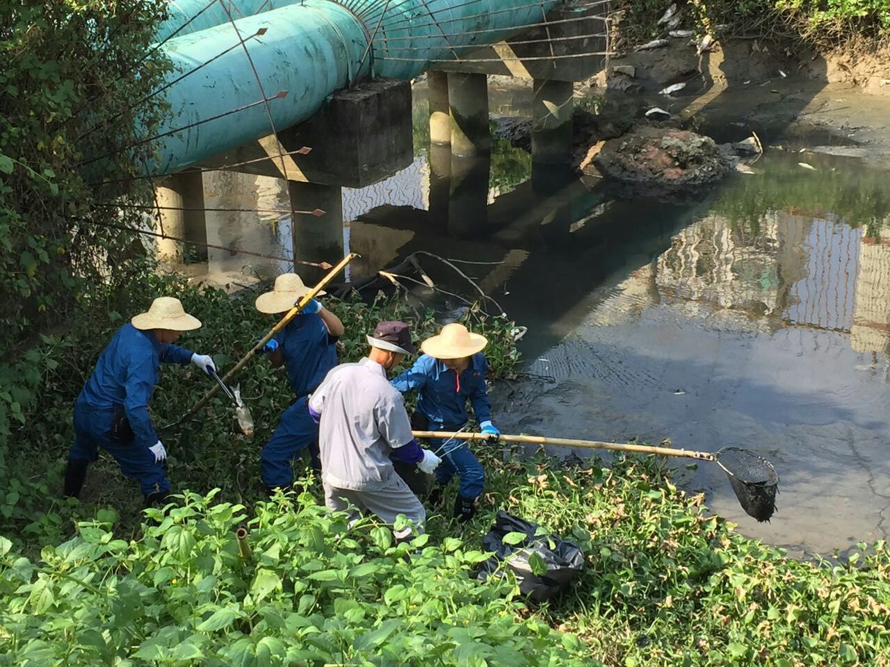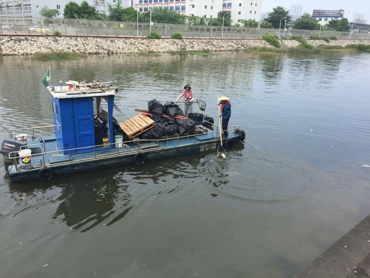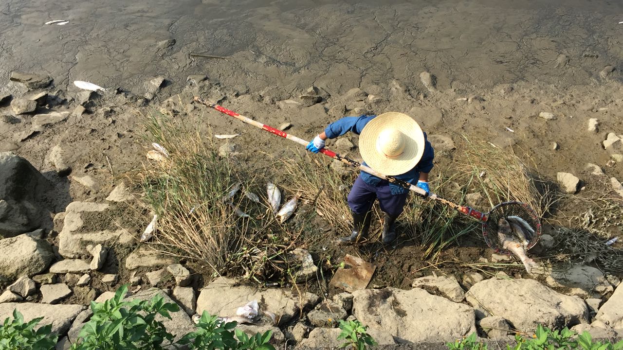 今日(15日)早上鴨涌河一帶繼續有死魚浮出,可能是日前死魚隨著潮漲被水流從隱暱處沖出,海事及水務局繼續派船隻和人員清理,以保持海面環境清潔,環境保護局亦已派員到現場調查及採集水樣檢驗。