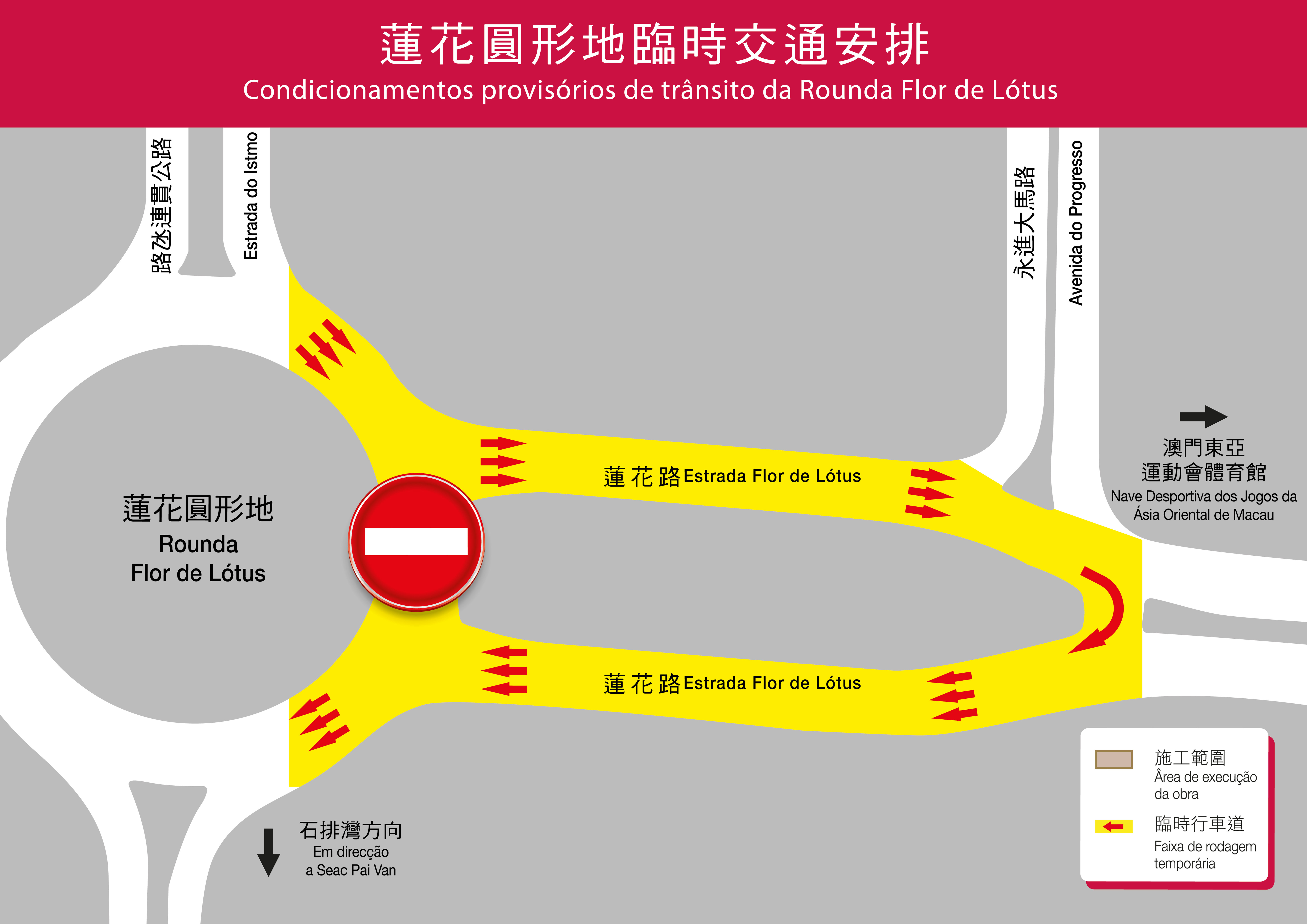 配合輕軌高架橋吊裝工作,自周四(20日)起,蓮花圓形地部分路段實施臨時封閉,禁止車輛通行,為期約40日。運輸基建辦公室與交通事務局呼籲公眾留意。