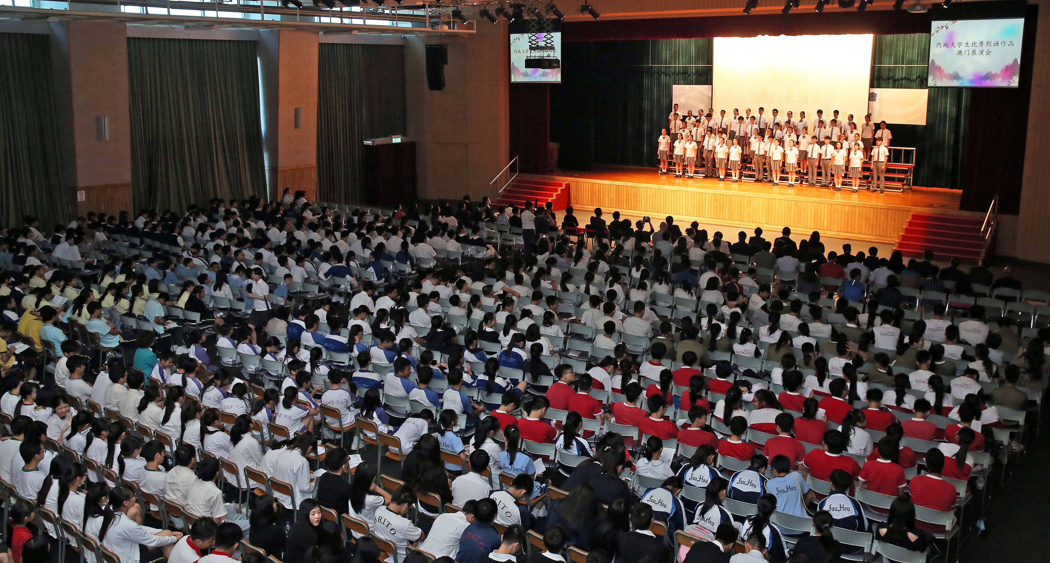 展演會由中國傳媒大學、重慶大學學生攜手演出。中國傳媒大學及重慶大學是內地優秀的高校,兩校帶來了“齊越朗誦藝術節暨全國大學生朗誦大會”推薦的優秀獲獎作品。當中,朗誦環節聲音嘹亮,感情飽滿,還加入粵語和閩南語演繹;繞口令環節,字正腔圓;配音秀環節最受全場師生歡迎,選取廣為澳門學生們所熟悉的動畫、電影,重新配音演繹,趣味盎然。精彩的表演,贏得全場學生陣陣掌聲。澳門勞工子弟學校派出老師,教業中學亦派出學生參與朗誦,交流氣氛熱烈。