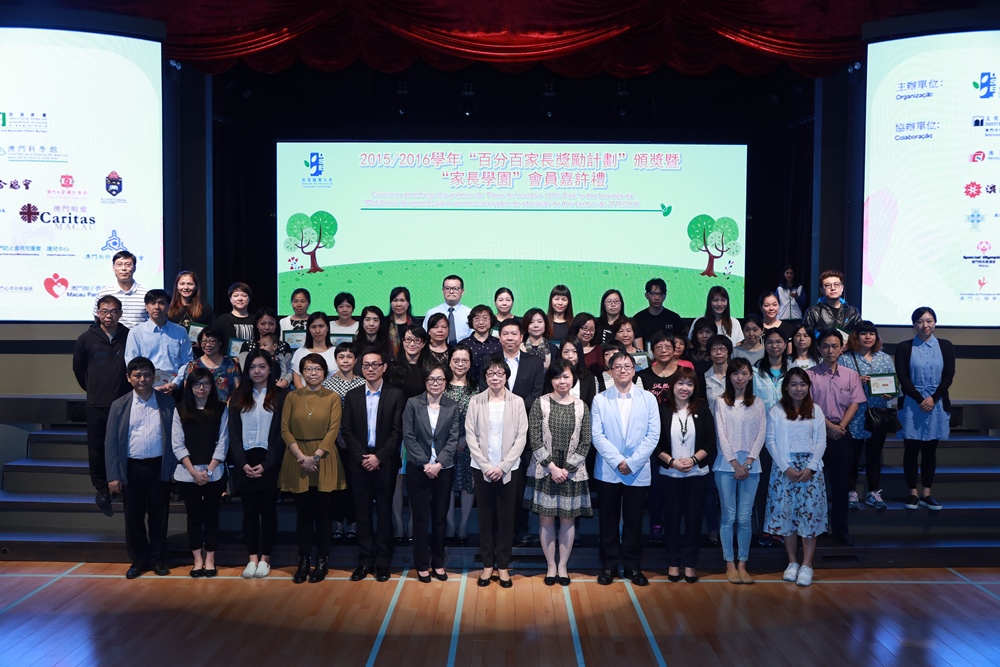 為表揚熱心及積極參與家長教育及親子活動的家長,教青局於11月6日上午10時30分假聖保祿學校禮堂舉行2015/2016學年“百分百家長獎勵計劃”頒獎暨“家長學園”會員嘉許禮。同場亦進行2016/2017學年“百分百家長獎勵計劃”啟動儀式,出席者包括教青局副局長郭小麗、郵政局副局長梁祝艷,以及30多位來自教育機構及社團的代表。