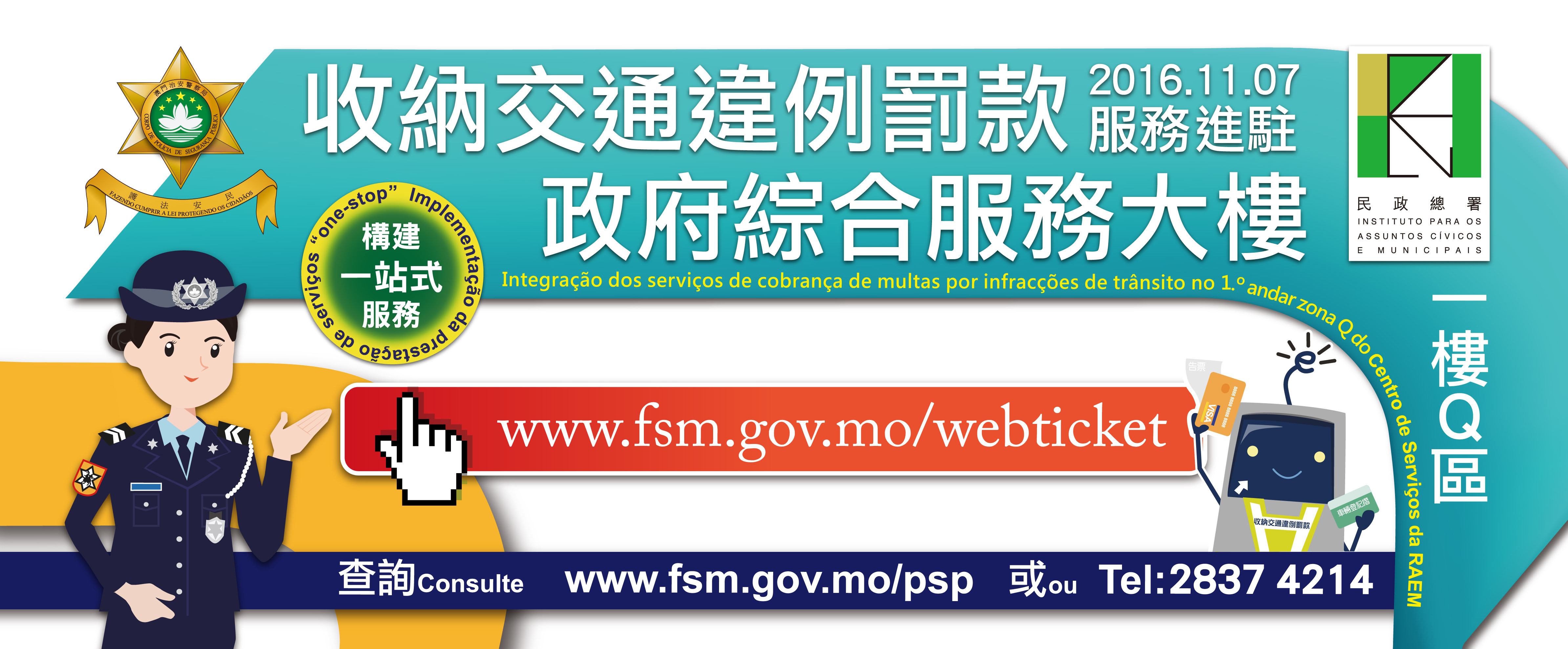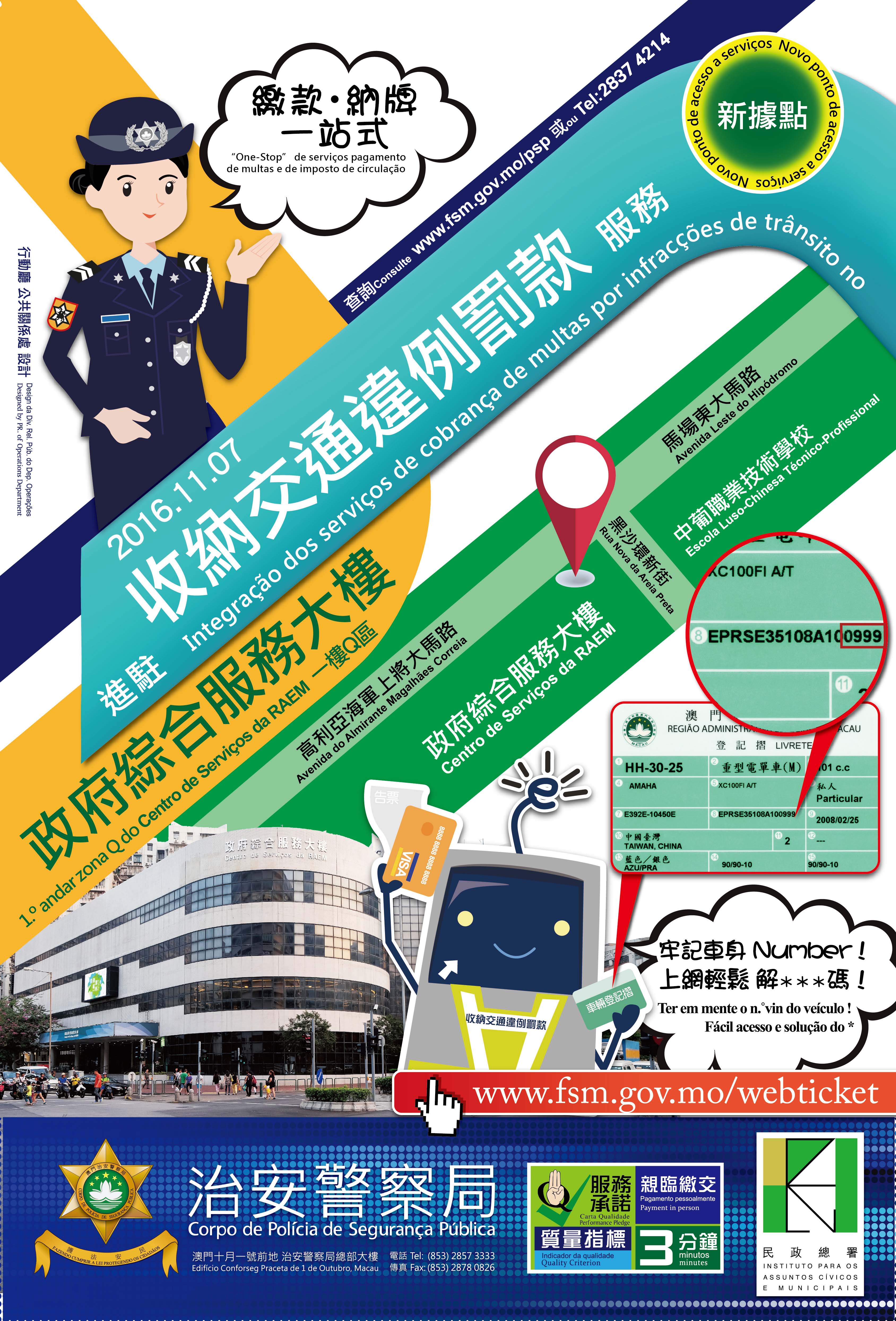 治安警察局出入境事務廳繼去年11月在政府綜合服務大樓投入服務後,為配合政府服務集中化的跨部門「一站式」發展以及加強落實便民之措施,本年再新增一項惠民服務。本局與民政總署透過簽訂服務協議模式,於北區政府綜合服務大樓一樓Q區增設一項收納行政違法的交通違例罰款之服務,相關服務於2016年11月7日起實施,而服務時間為星期一至五上午9時至下午6時,中午照常辦公。公眾如欲進一步瞭解服務詳情,可瀏覽本局網頁或致電交通廳服務熱線2837 4214查詢。
