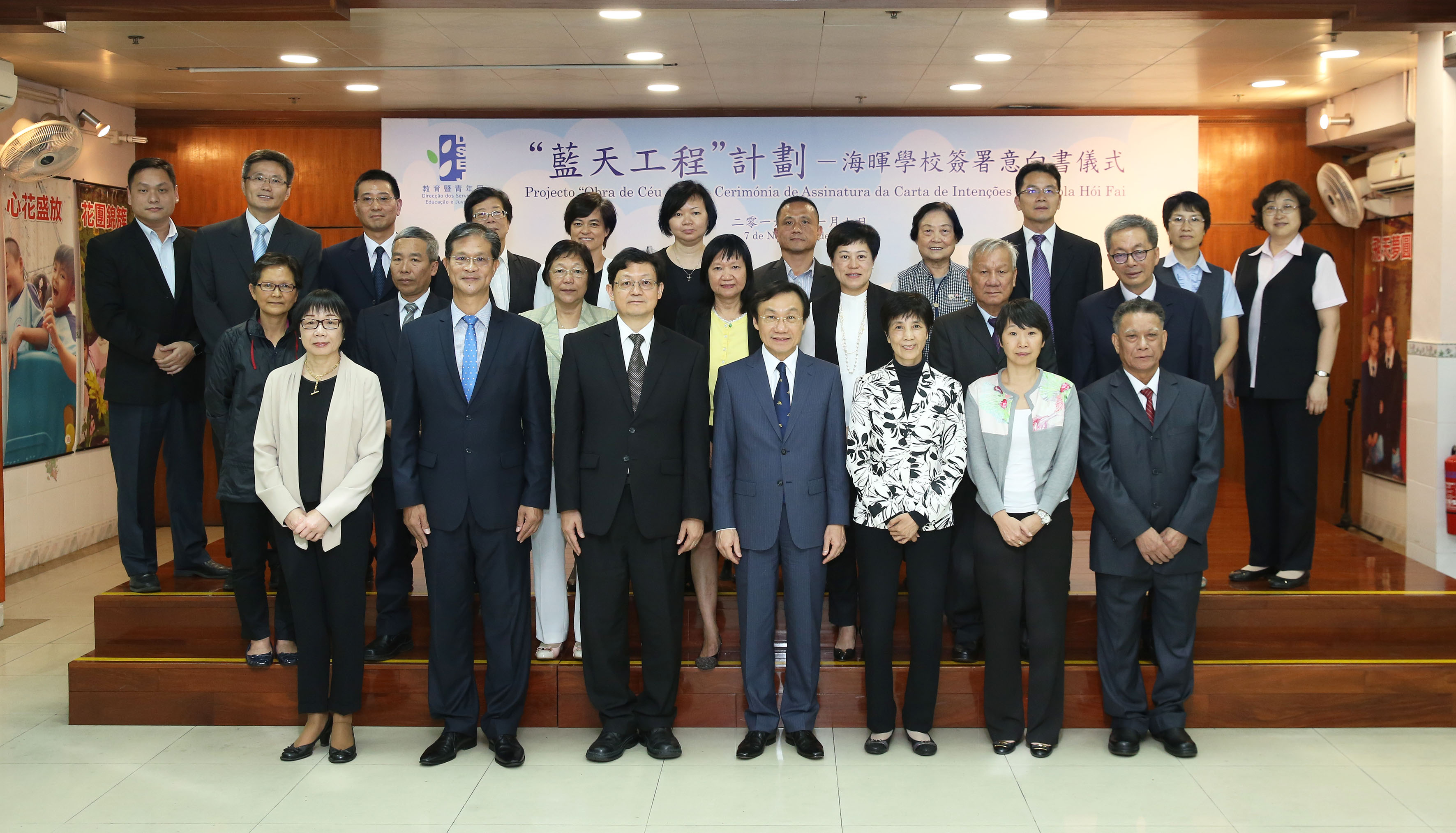 出席簽署儀式的還有社會文化司司長辦公室顧問惠程勇、教育暨青年局副局長郭小麗、財政局副局長鍾聖心;澳門工會聯合總會會長何雪卿、副會長關翠杏、馮家輝;中華教育會會長何少金、理事長陳虹;漁民互助會前會長郭沛、副會長布小玲;各校校長包括戴燦林、王國英、梁詠琴、江超育、呂吉實;教育暨青年局各部門主管、漁民互助會及海暉學校代表等一眾嘉賓共60多人。
