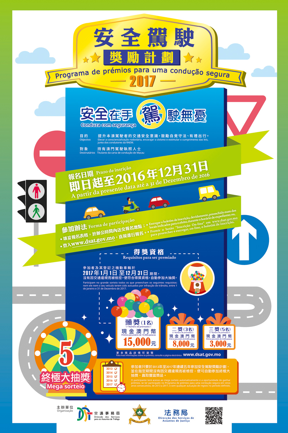 由交通事務局、治安警察局及法務局合辦的“安全駕駛獎勵計劃2017”,今年口號為「安全在手 駕駛無憂」,旨在鼓勵駕駛者出行時注意自身及他人安全,遵守交通規則,安全駕駛,減少交通意外的發生。