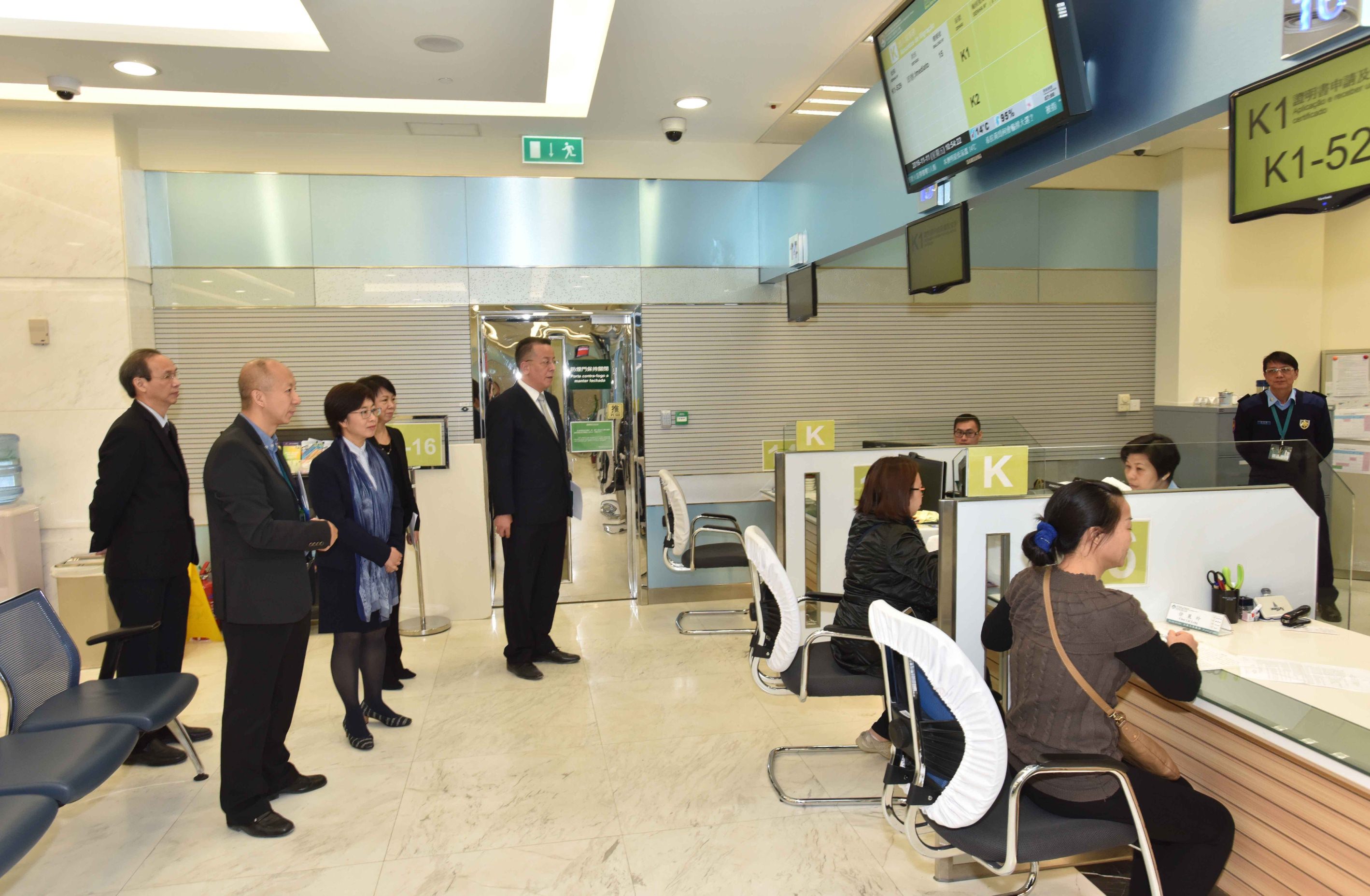陳海帆司長在相關部門領導的陪同下,分別巡視了公共行政大樓內的各登記局和公證署、身份證明局的辦領證件大堂和自助辦證區,以及政府綜合服務大樓的各服務區和24小時自助服務區,陳司長重點關注各部門在推行電子政務、程序簡化及跨部門合作方面的落實情況。