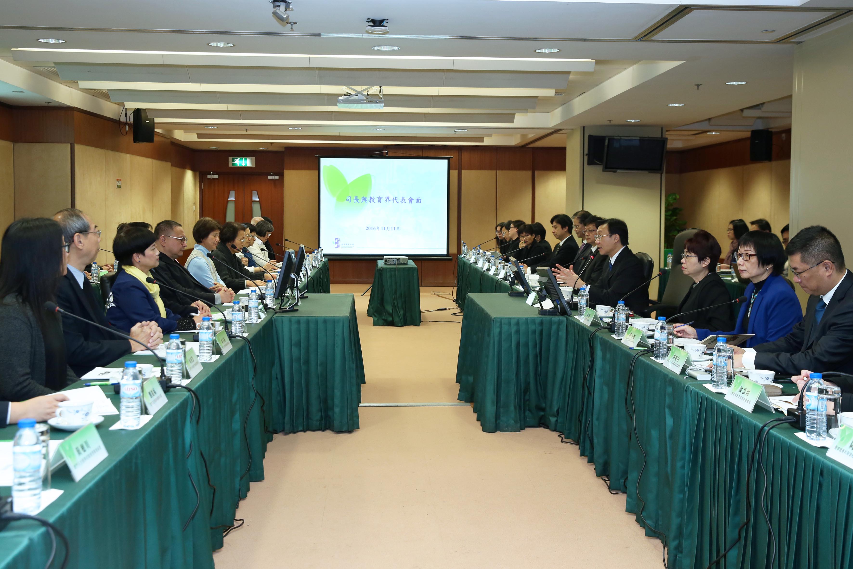 社會文化司司長譚俊榮率領教育暨青年局局長梁勵,副局長老柏生、郭小麗和各主管人員,於11月11日在教青局分別與澳門天主教學校聯會和澳門中華教育會的代表舉行會議,以加強與澳門教育界的溝通,就彼此關心的議題交換意見。