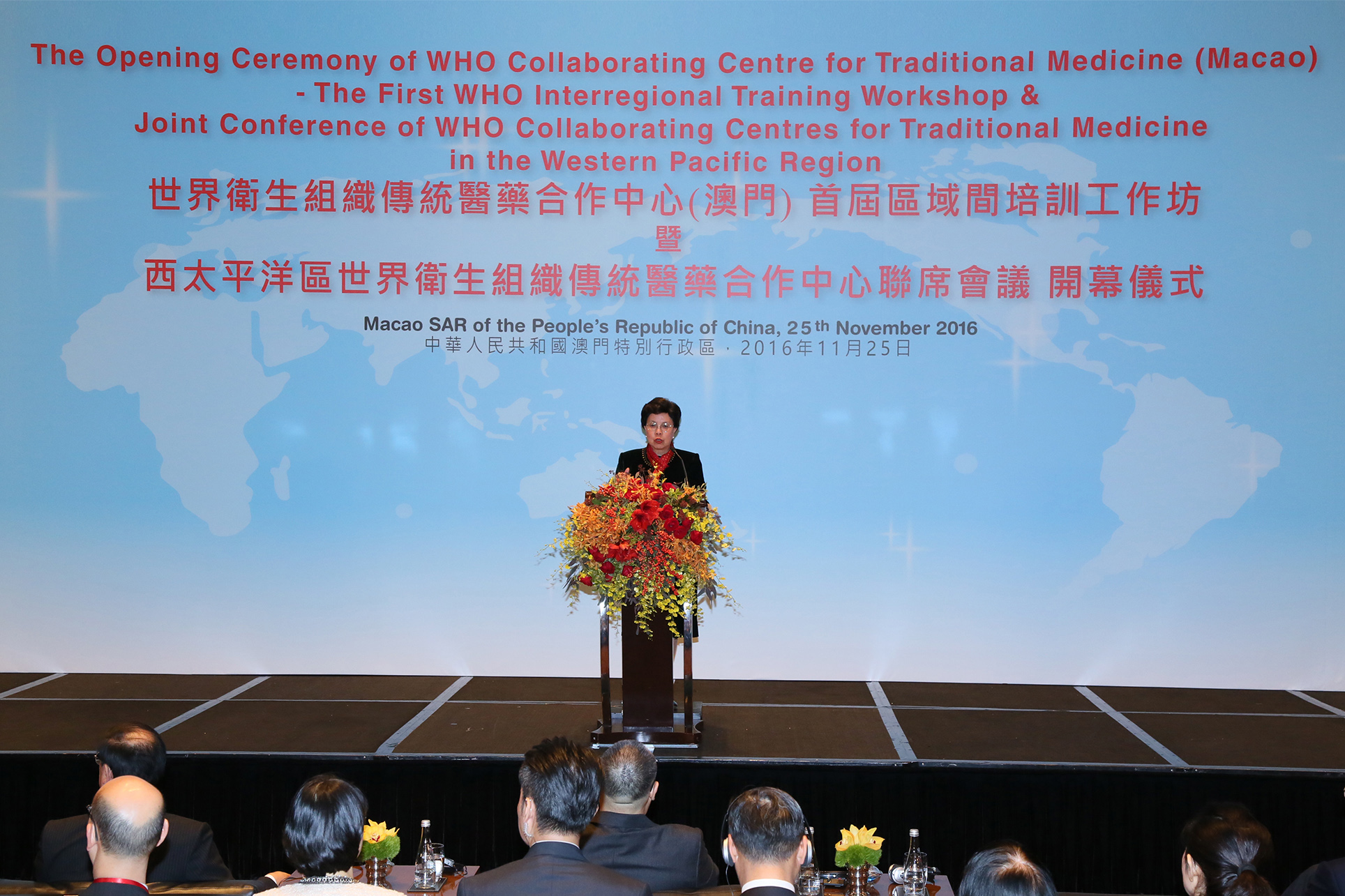 澳門特別行政區行政長官崔世安博士在開幕式致辭中表示,中醫藥在澳門有悠久的歷史,特區政府重視中醫藥的傳承與發展,尤其關注中醫藥的規範化管理,致力完善中醫藥的監管系統,持續優化藥物監管機制。此外,特區政府亦將中醫藥產業化作為促進經濟適度多元發展的重要手段,促進澳門產業結構的調整。他提及澳門與廣東省共同在橫琴建設中醫藥科技產業園,能充分發揮澳門連接葡語國家的橋樑作用,推動澳門中醫藥產業化和國際化。特區政府還將配合中央政府對“一帶一路”的戰略規劃,加強與沿線國家在傳統醫藥領域的合作,積極參與中醫藥的建設發展。他指出,世衛傳統醫藥合作中心(澳門)的設立代表著國際對澳門傳統醫藥發展的認可,也是國家以至世界對未來澳門中醫藥發展的期望與要求。他表示特區政府會在推廣有效和安全使用中醫藥的過程中,承擔應有的責任,讓更多人接納和珍視包括中醫藥在內所有傳統醫藥的價值。