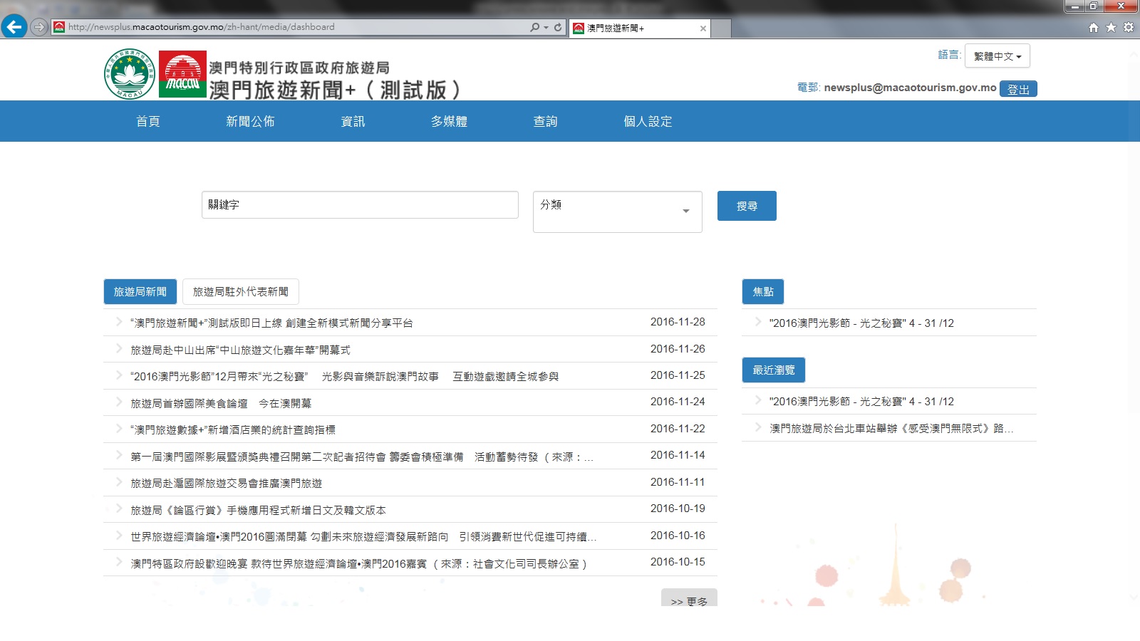 旅遊局抱着資訊透明及資源共享的理念,積極推進電子政務工作,繼去年底推出“澳門旅遊數據+”網上統計資料平台,現推出“澳門旅遊新聞+”網上新聞資料庫(測試版)。資料庫目前提供超過一千二百條新聞公佈、一千七百多條活動資料及近四千張圖片等共超過七千三百條記錄;將持續更新內容、增加新聞發佈者及載入更多過往資料,逐步豐富資料庫內容。