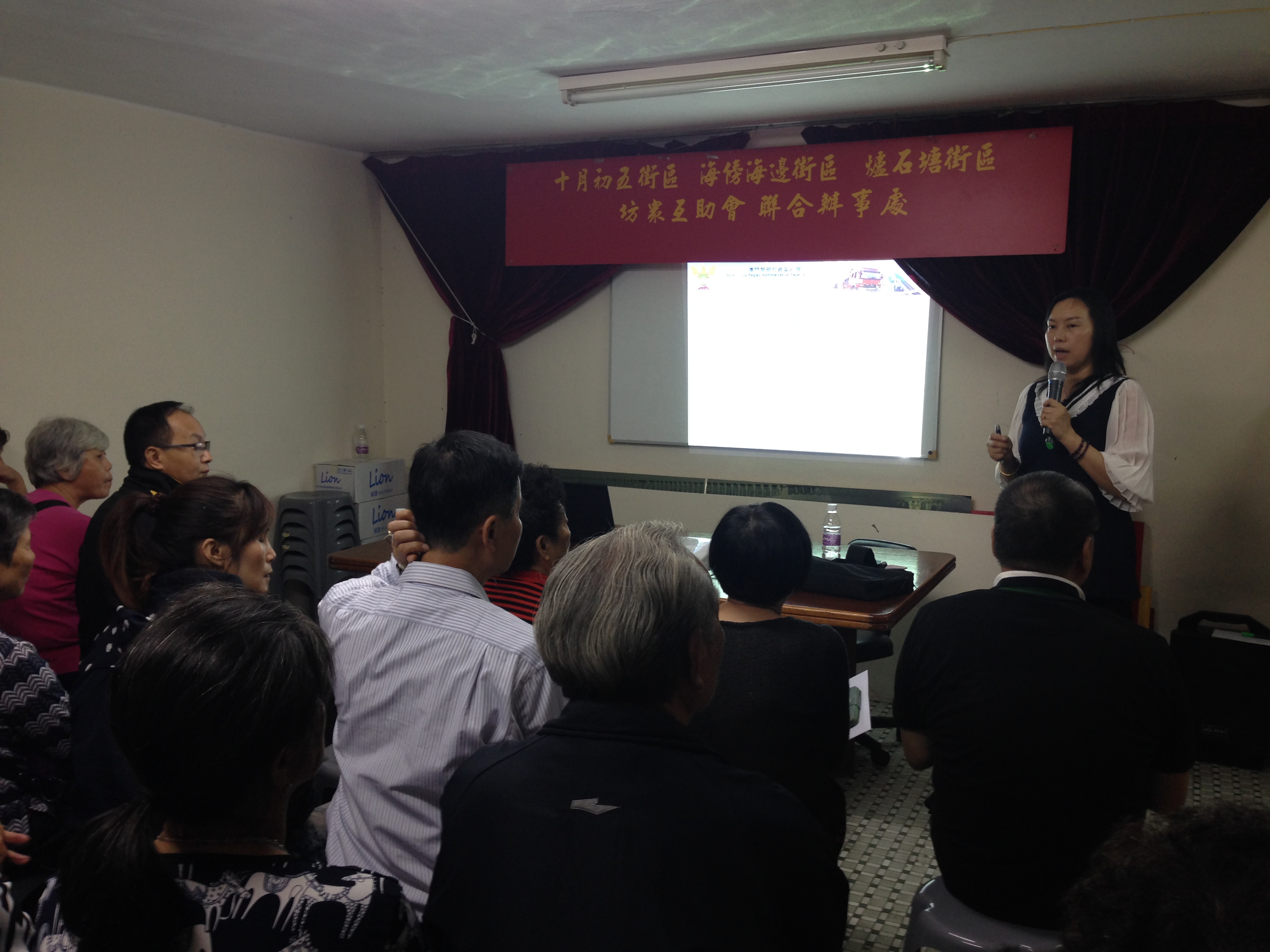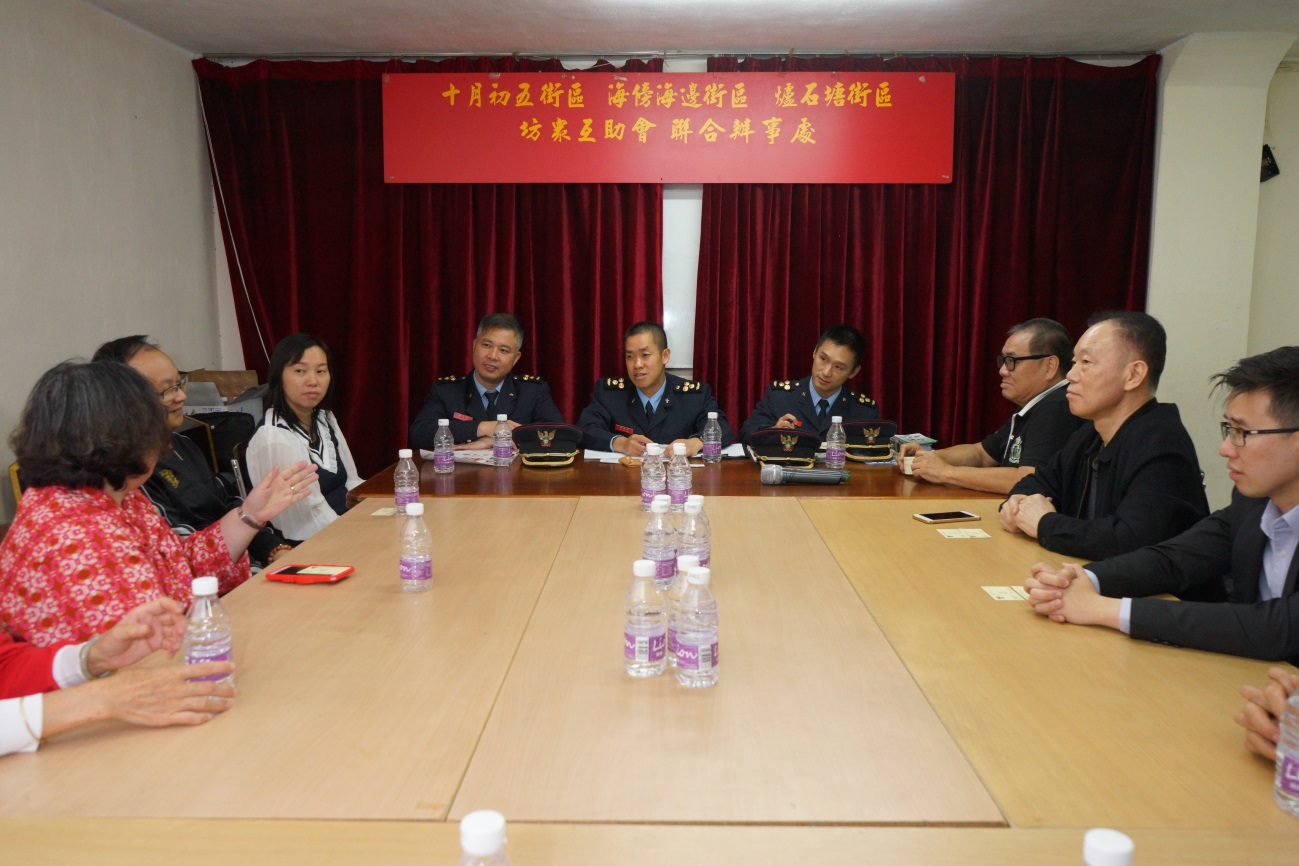 消防局於本年12月5日派出官員拜訪“兩海坊眾互助會、十月初五坊眾互助會、爐石塘坊眾互助會”等多個坊會團體,並為有關坊會的會員舉辦燃料安全知識講座;其後,與上述坊會負責人進行座談,就該區的消防工作進行討論並交換意見,希望達到“預防火災,全民有責,警力有限,民力無窮”的效果,活動中亦得到坊會義工的協助,在區內一帶派發防火宣傳品。