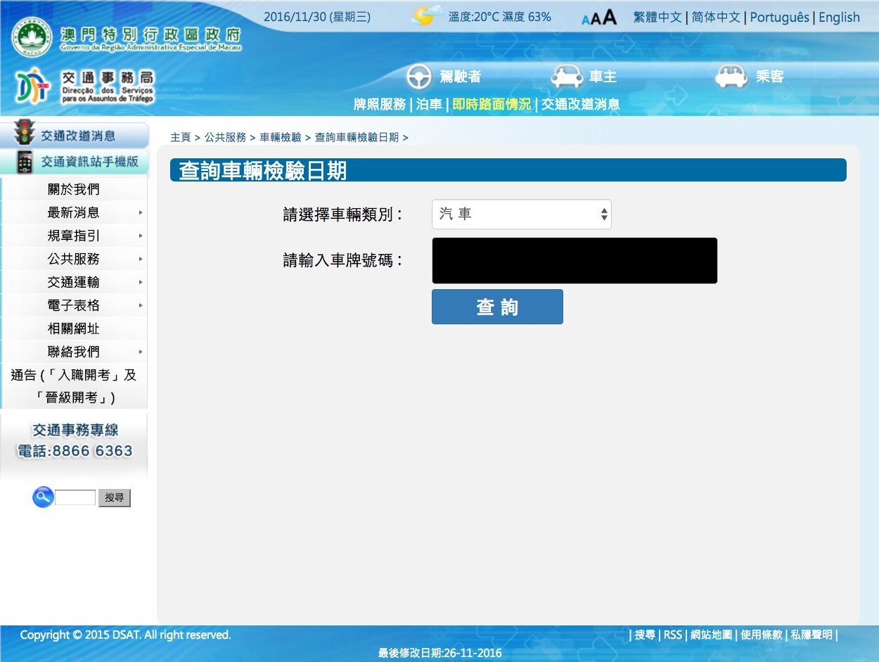 而因應縮短驗車年期的新安排,2017年車輛強制定檢的日期亦會有所調整。交通事務局已將2017年車輛強制定檢的相關資料上載至官方網頁www.dsat.gov.mo,車主可以直接上網查閱,以盡早掌握車輛強制的定檢日期。另一方面,車主可申請郵政局的「安全電子郵箱」帳戶接收電子版車輛年檢通知書。而局方將透過流動電話的短訊方式,提示相關車主車輛強制定期的日期。