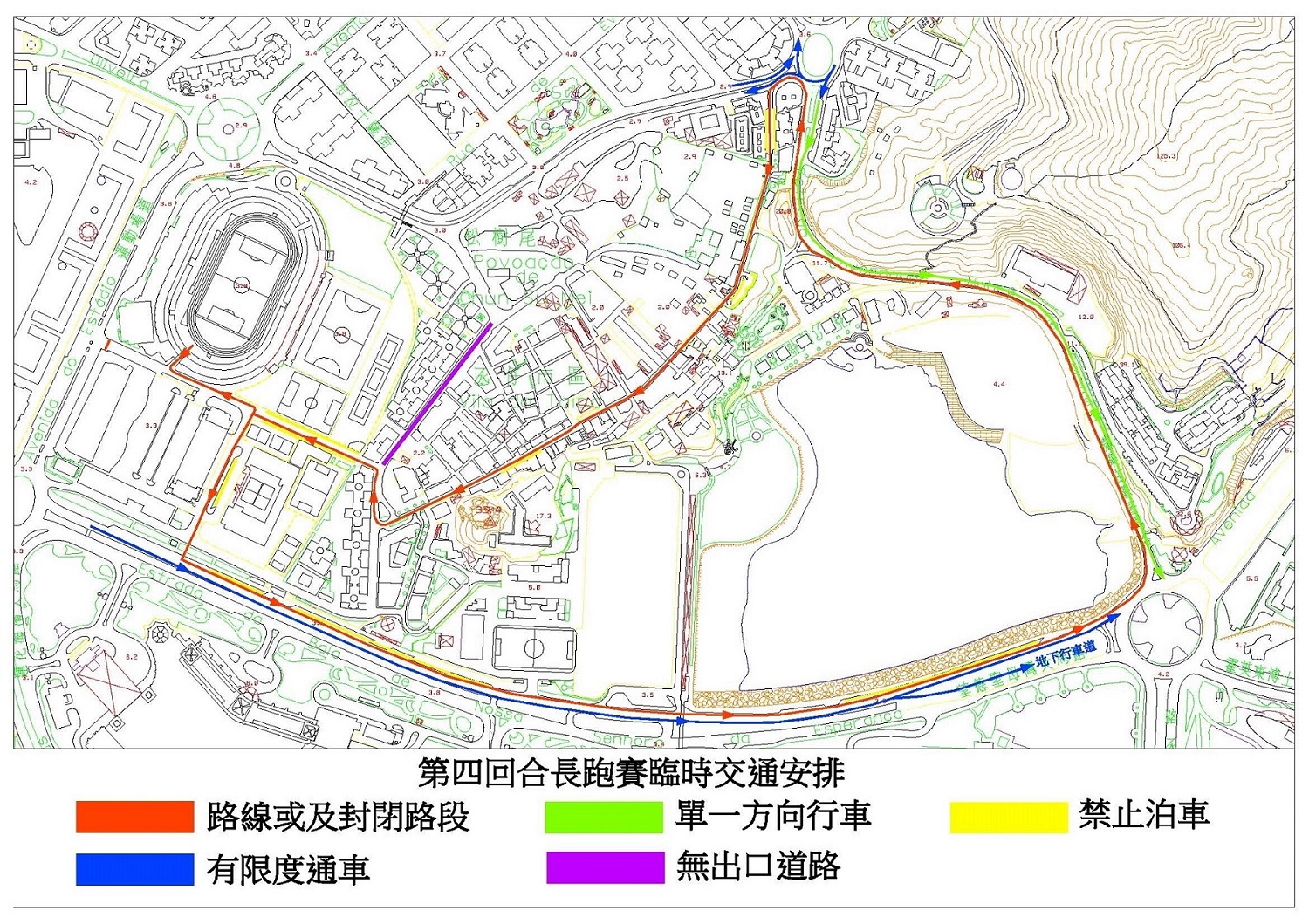 比賽日(31日)晚上7時至9時,體育路、學院路、飛能便度街、施督憲正街、告利雅施利華街、巴波沙總督前地、地堡街及嘉樂庇總督馬路部分路段封閉交通;嘉樂庇總督馬路靠近山一側之車行道則臨時改作單向行車;至於排角道及地堡街部分路段亦會臨時改為無出口道路。