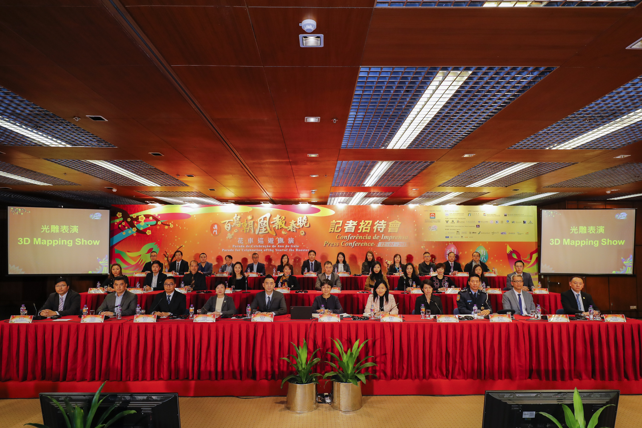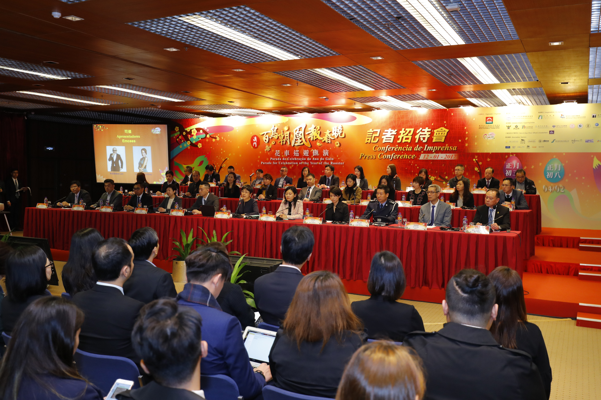 由旅遊局主辦、民政總署、體育局及文化局協辦、中華人民共和國國家旅遊局為贊助單位的“百鳥朝凰報春曉花車巡遊匯演”記者招待會今(12日)在旅遊活動中心舉行。旅遊局局長文綺華、體育局代局長劉楚遠、旅遊局副局長謝慶茜、民政總署市民事務辦公室部長高佩珊、文化局演藝活動處處長李碧琪,以及支持單位與贊助機構的代表出席。
