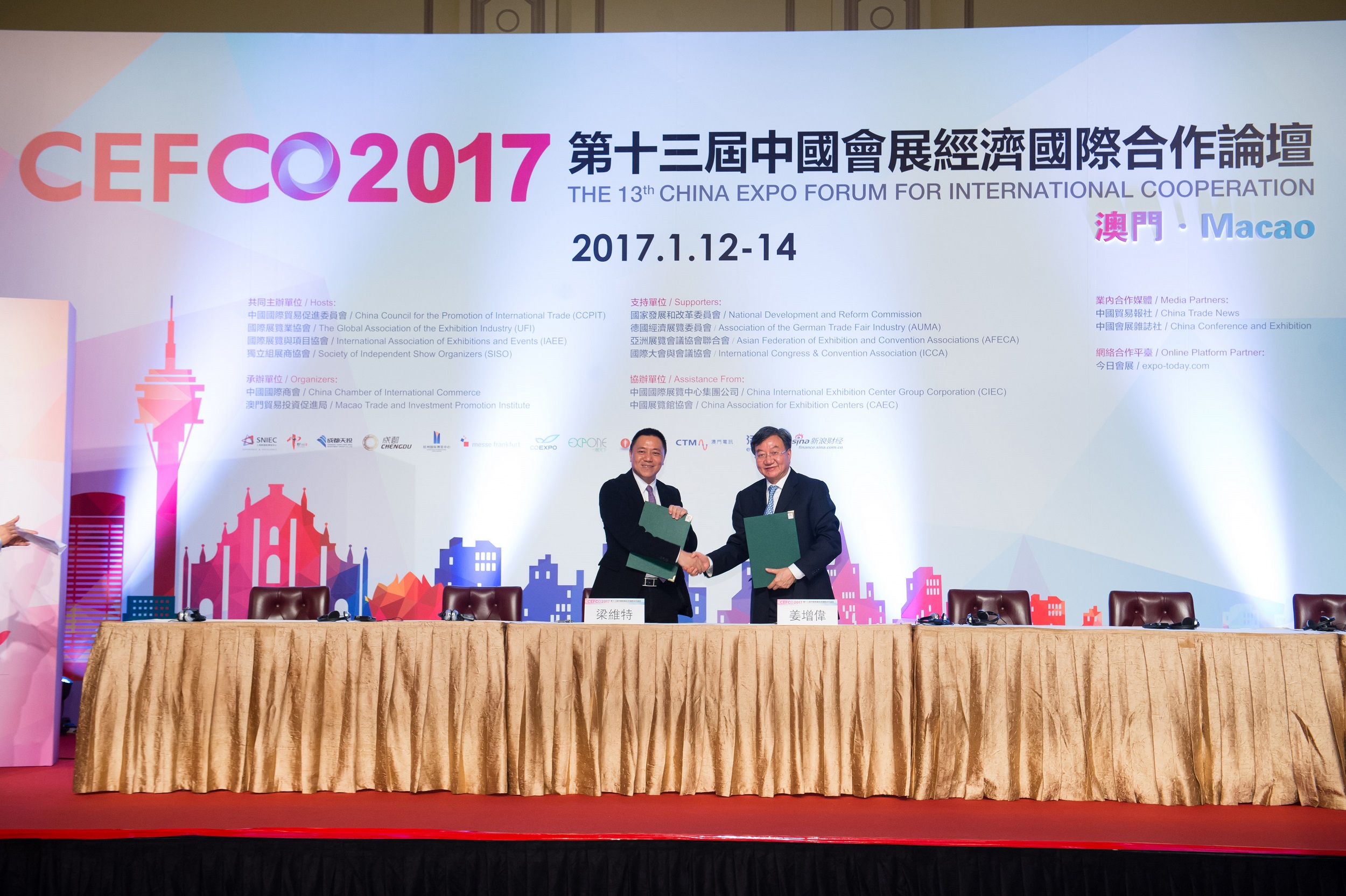 由中國國際貿易促進委員會(CCPIT)與國際展覽業協會(UFI)、國際展覽與項目協會(IAEE)、獨立組展商協會(SISO)聯合主辦,中國國際商會和澳門貿易投資促進局承辦“第十三屆中國會展經濟國際合作論壇”(CEFCO 2017)今(12)日假澳門威尼斯人-度假村-酒店正式拉開帷幕。首日論壇成功簽署了4份協議及合作意向書。