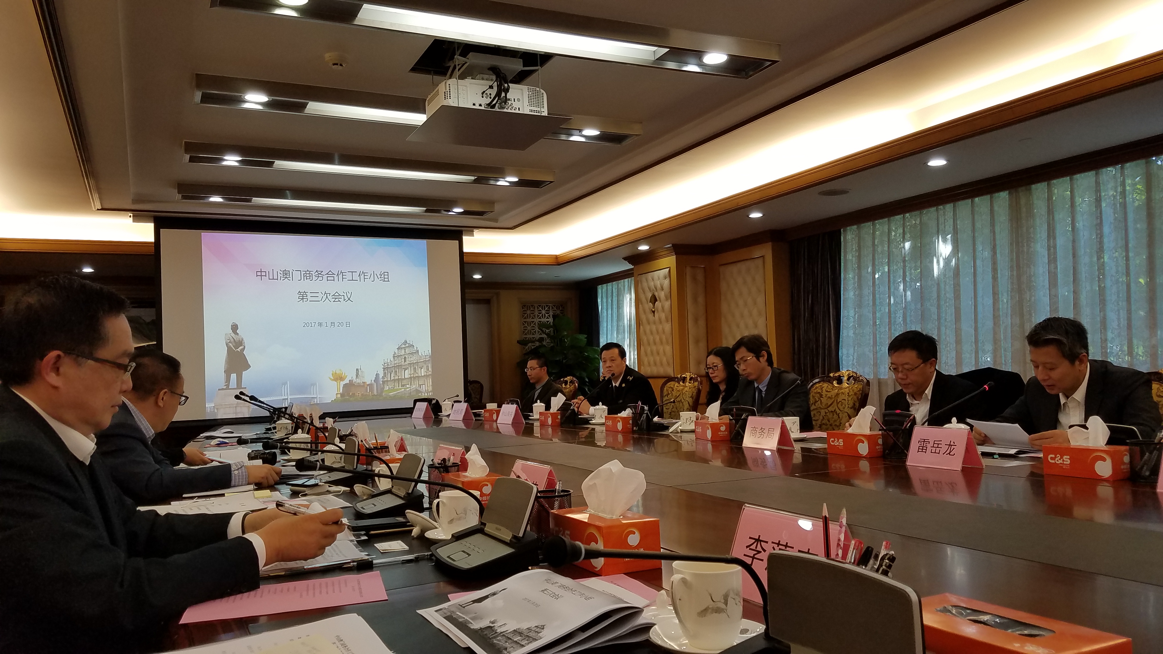 澳門貿易投資促進局主席、商務合作工作小組澳門方組長張祖榮率領一行7人,於1月20日到中山,與中山市人民政府副市長、商務合作工作小組中山方代表領導雷岳龍,進行中山與澳門商務合作工作小組會議,議程主要總結2016年度中山與澳門在商務合作方面的工作、探討及交流2017年工作計劃及完善兩地商務合作發展方式等。