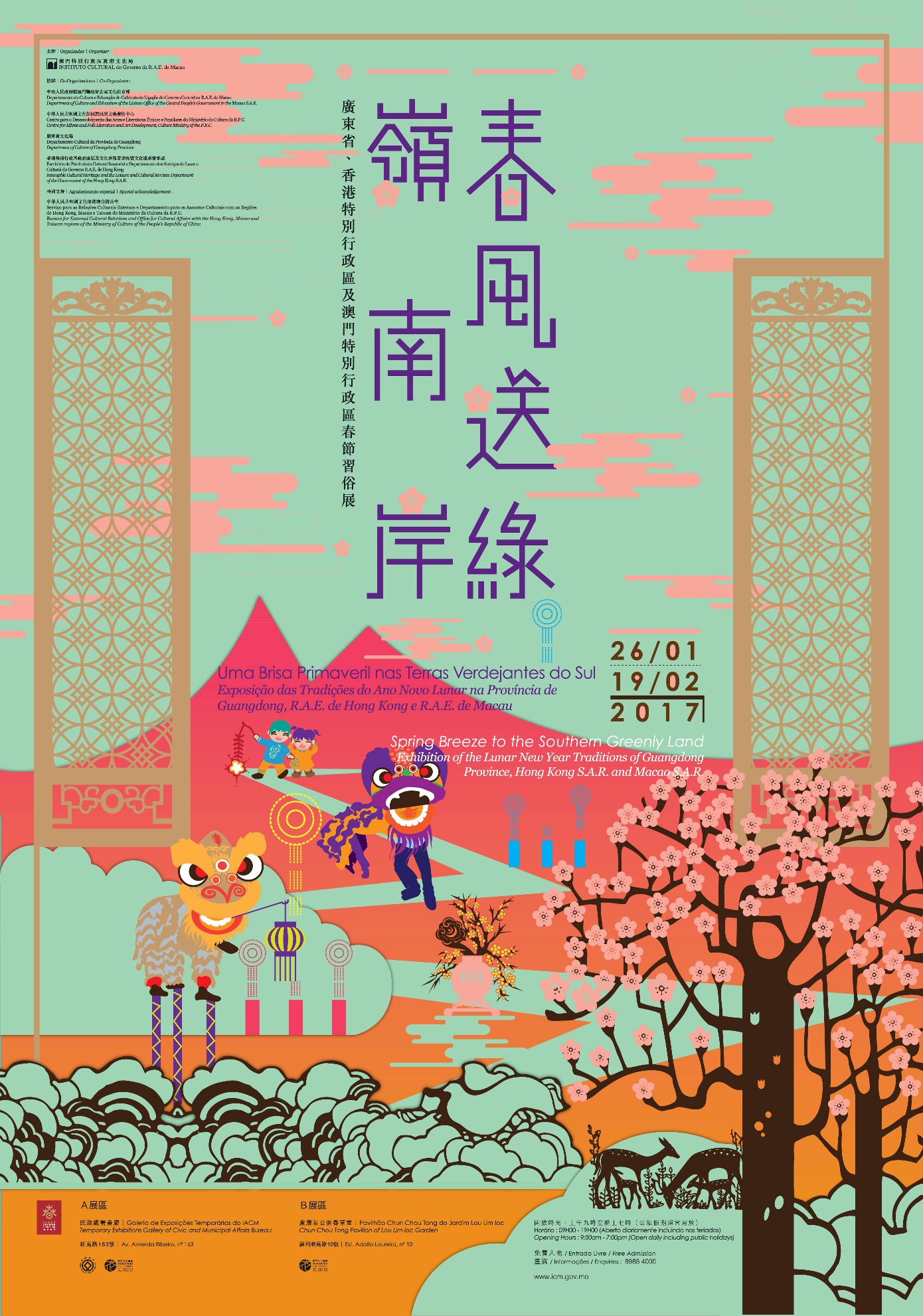 《春風送綠嶺南岸——廣東省、香港特別行政區及澳門特別行政區春節習俗展》將於一月二十六日至二月十九日在民政總署畫廊(新馬路一百六十三號)及盧廉若公園春草堂(羅利老馬路十號)展出,免費入場。開放時間為每日上午九時至晚上七時,公眾假期照常開放。有關展覽及講座詳情,查詢可於辦公時間內致電八九八八四零零零。