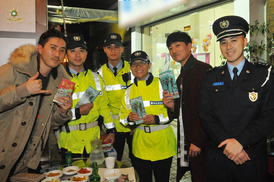 昨晚十時許,由本局交通廳李勤副警司聯同行動廳公共關係處黃偉俊副警司,帶領宣傳小隊一行七人到皇朝一帶進行相關宣傳活動。期間,沿途向酒吧內市民和旅客派發宣傳單張和賀年祝福利是封,並向他們講解在任何場所時刻都需具有自我保護的安全意識、拒絕陌生人提供不知名食品或飲料,以及提醒他們在歡欣後,緊記切勿酒後駕駛等。活動期間,警員讓市民及遊客嘗試以酒精測試機進行呼氣測試,他們亦有相當興趣體驗。