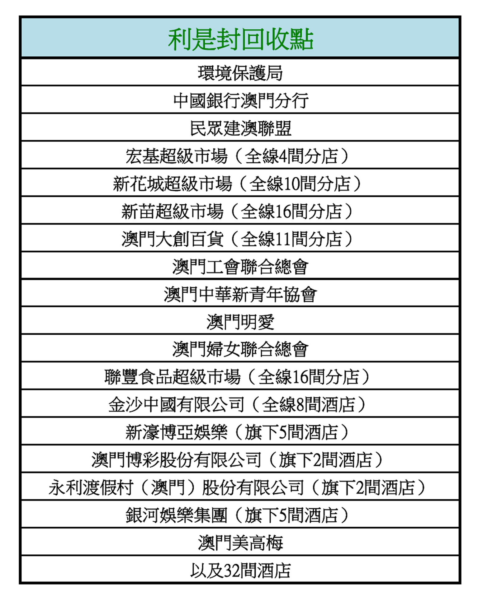 為貫徹資源回收、循環再用的環保政策,環境保護局藉新春期間推出回收利是封計劃,與多個公共部門、社團、商業機構和酒店(包括六大博彩企業)等合作設置超過120個回收點(詳見附圖),方便市民參與回收、支持環保工作,共渡綠色新年。