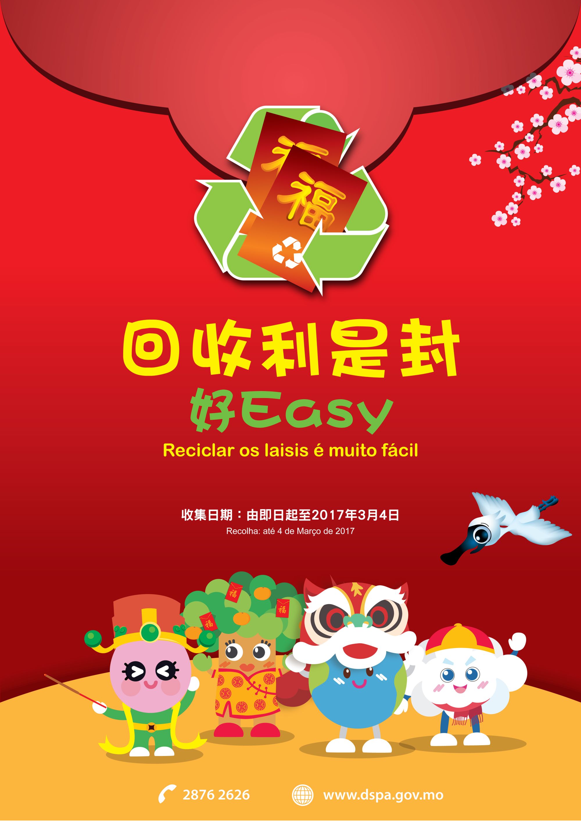 每逢農曆新年,親友間均會透過送贈利是以傳遞對新一年的祝福,儘管近年市民的環保意識已不斷提高,不少市民都會採用可重用的利是封,減少不必要的浪費,但每年仍有一定數量仍可重覆使用的利是封被棄置。為貫徹資源回收、循環再用的環保政策,環境保護局推出自願性質、非獎賞形式的回收利是封計劃,透過與多個公共部門、社團、商業機構和酒店(包括六大博彩企業)等合作,由即日起至本年3月4日期間在全澳各區設置超過120個回收點,希望藉社區網絡方便市民實踐環保行為,將完好且多出的舊利是封回收重用,以實際行動支持環保工作,減少浪費紙張。市民可透過環境保護局網頁(www.dspa.gov.mo)查閱活動詳情,亦可致電“環保熱線”(2876 2626)查詢。