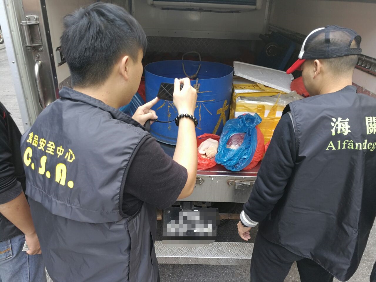 海關聯同民署食品安全中心執法人員,昨日(4日)早上在澳門北區一帶巡查時,查獲一宗涉嫌銷售及走私未經檢疫鮮活食品的案件,在涉案貨車上查獲35隻已宰禽鳥共重62.5公斤、3公斤禽鳥內臟、96公斤豬肉、7公斤豬內臟、20公斤牛肉、32公斤貝殼類及4公斤蛙類,緝獲物共重224.5公斤。海關將涉案人帶回總部協助調查,並以行政違法作出檢控。