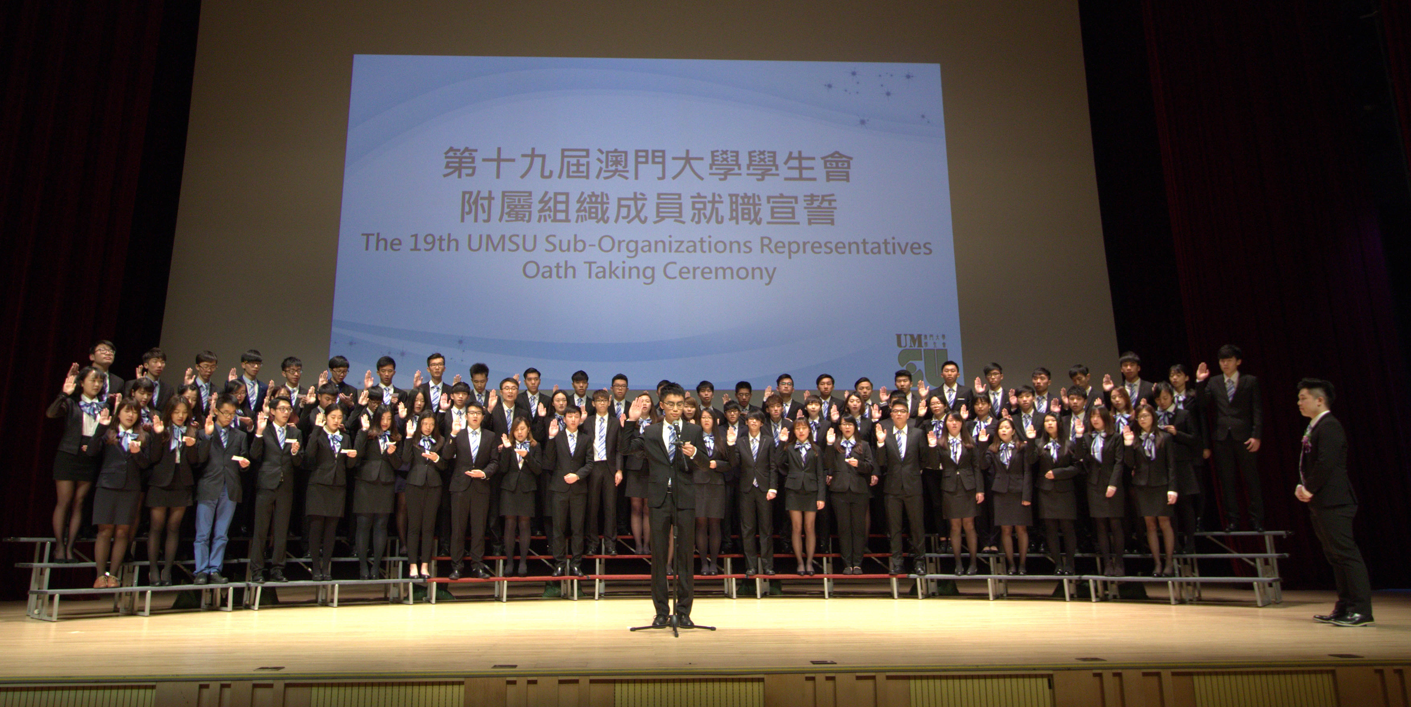 澳門大學學生會昨(8)日舉行第十九屆澳大學生會領導機關及附屬組織就職典禮,新一屆學生會領導機關及77個學生會附屬組織的會長在澳大校董會主席林金城、校長趙偉及一眾嘉賓見證下宣誓。