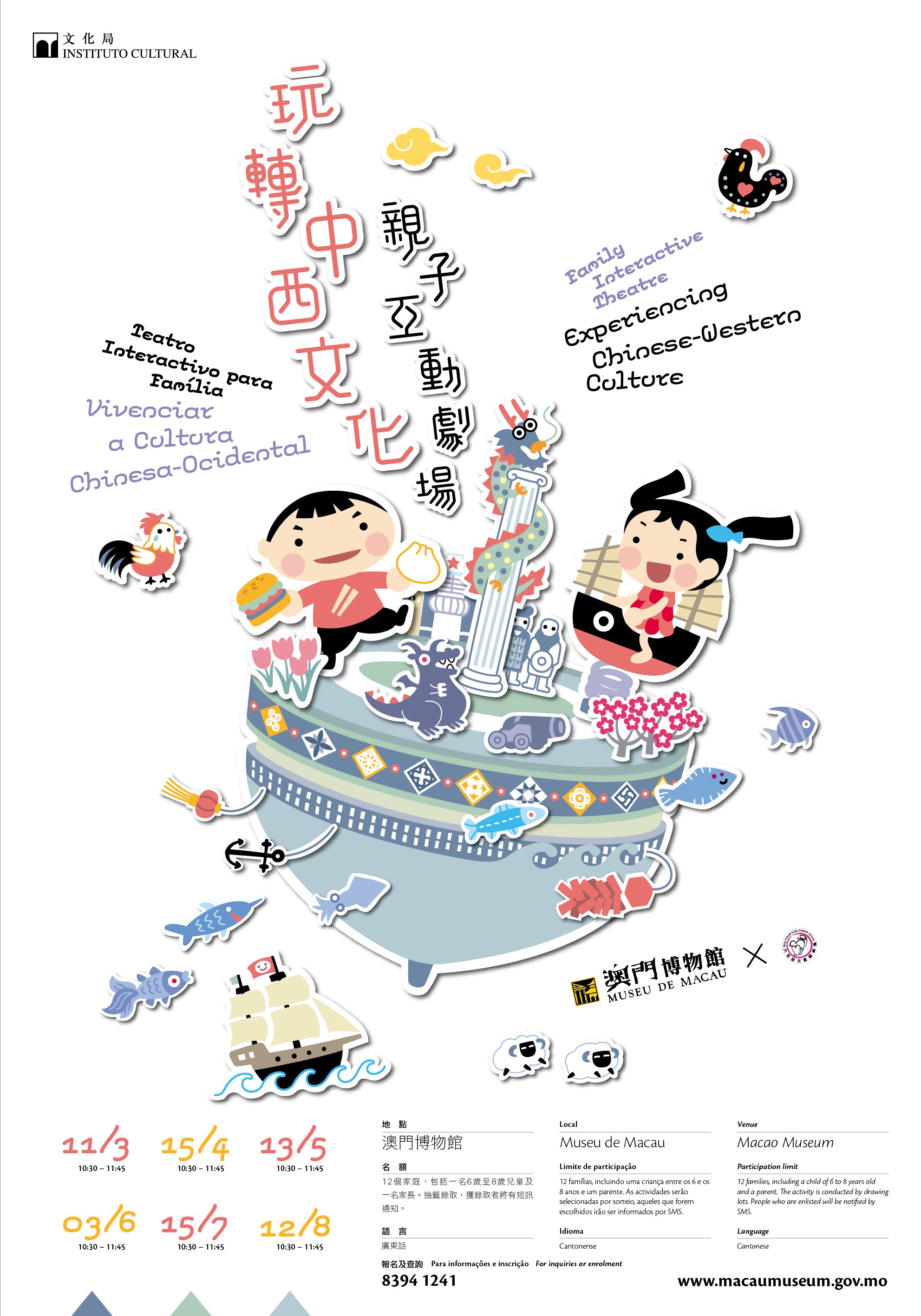 文化局澳門博物館將於三月至八月期間舉辦六場“玩轉中西文化親子互動劇場”,並由大老鼠兒童戲劇團協辦,日期為三月十一日、四月十五日、五月十三日、六月三日、七月十五日及八月十二日,上述日期均為周六,時間為上午十時半至十一時四十五分,費用全免,歡迎市民參加。