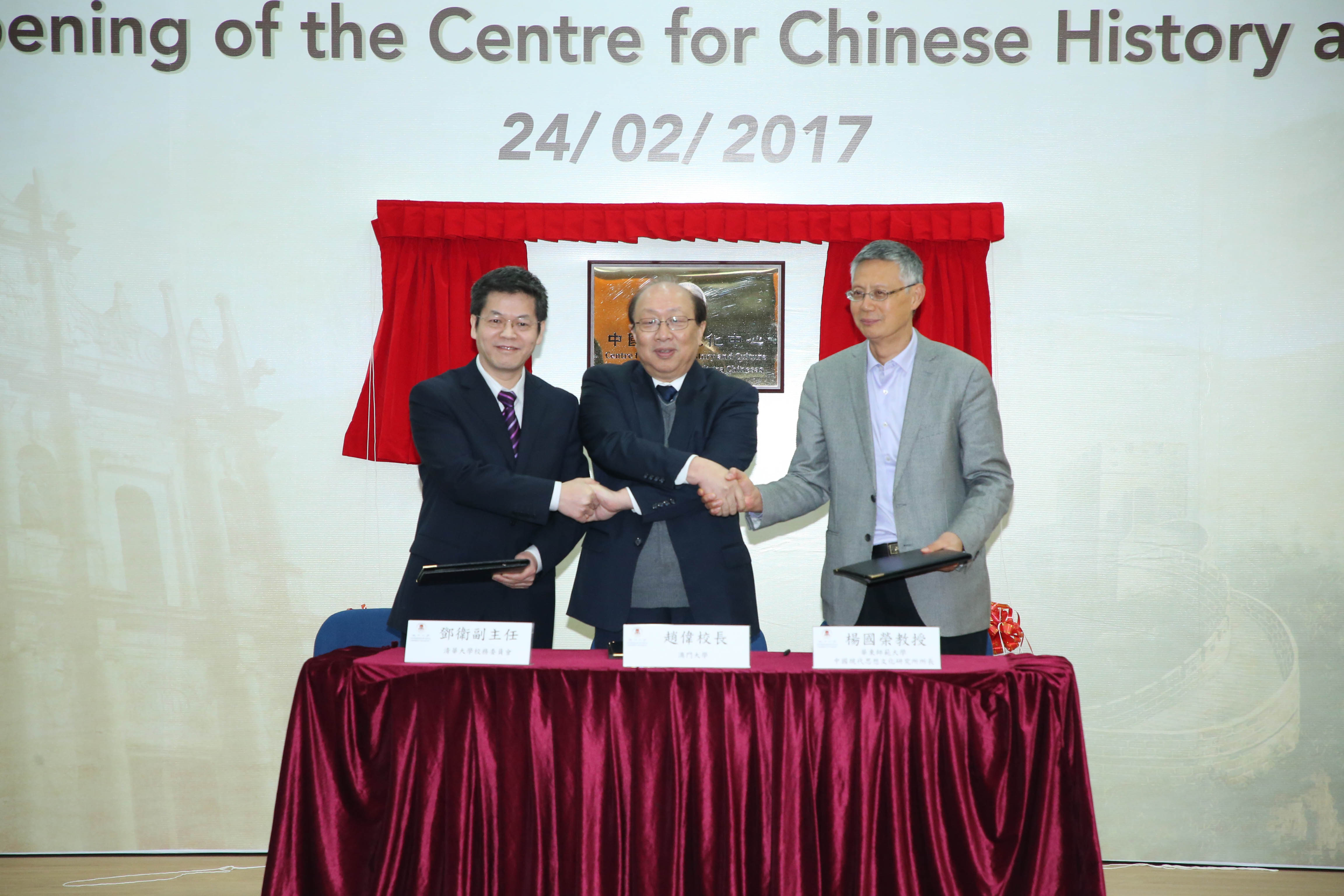 澳大中國歷史文化中心已被列入教育部人文社會科學重點研究基地建設,將夥同清華大學、華東師範大學共同建設這一國家級研究平台。典禮上,逾百名嘉賓共同見證三校簽署合作意向書,三所高等院校今後將大力合作,就推廣中國歷史文化的學術研究及相關的學術交流活動達成共識。