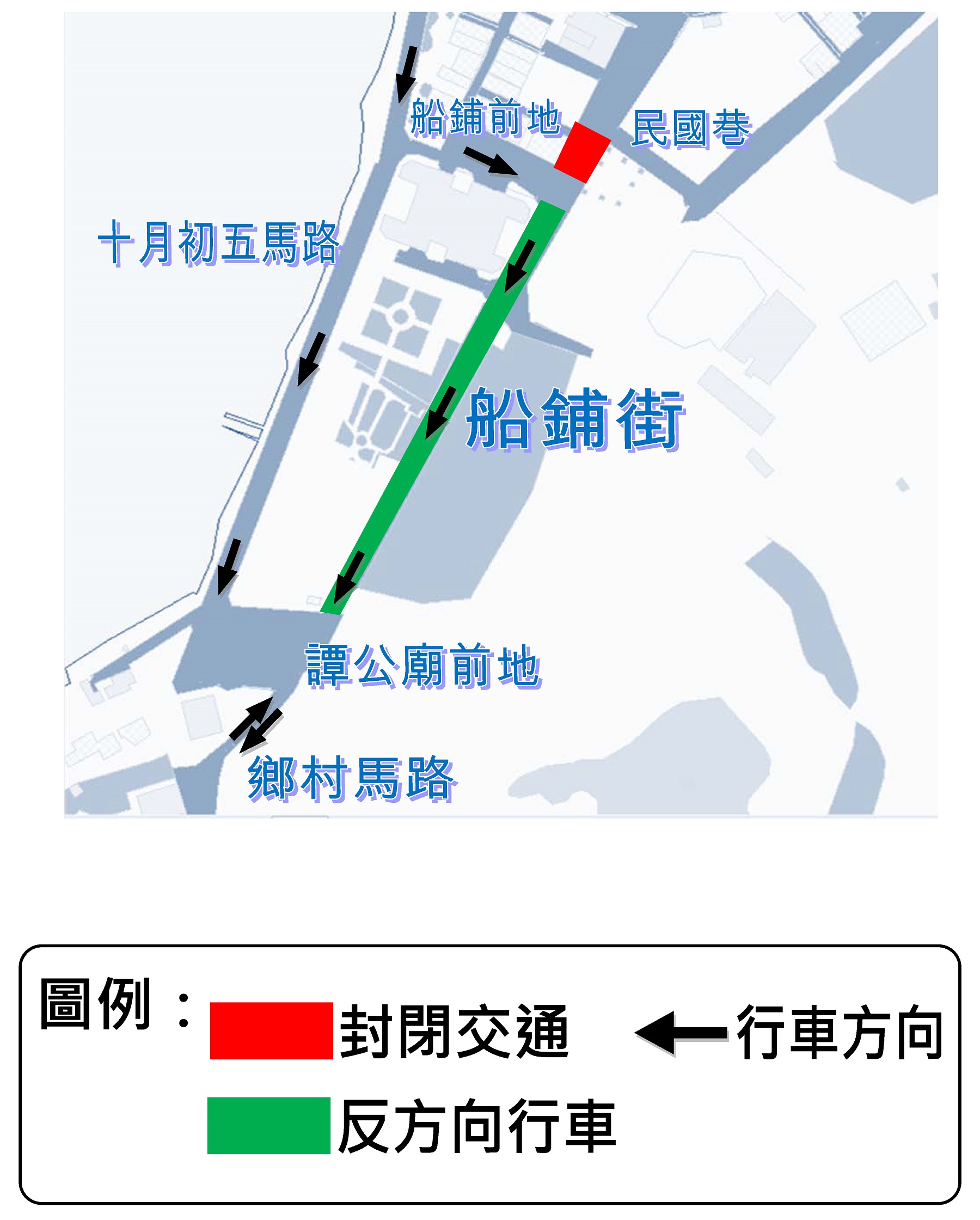 配合民政總署維修渠道,由2月27日(周一)起,介乎路環船鋪前地與民國巷之間的一段船鋪街封閉交通;介乎船鋪前地與譚公廟前地之間的一段船鋪街則實施反方向行車,即車輛只可由船鋪前地往譚公廟前地方向行駛,為期約15日。交通事務局呼籲駕駛者留意路上所設置之臨時交通標誌,小心行車。