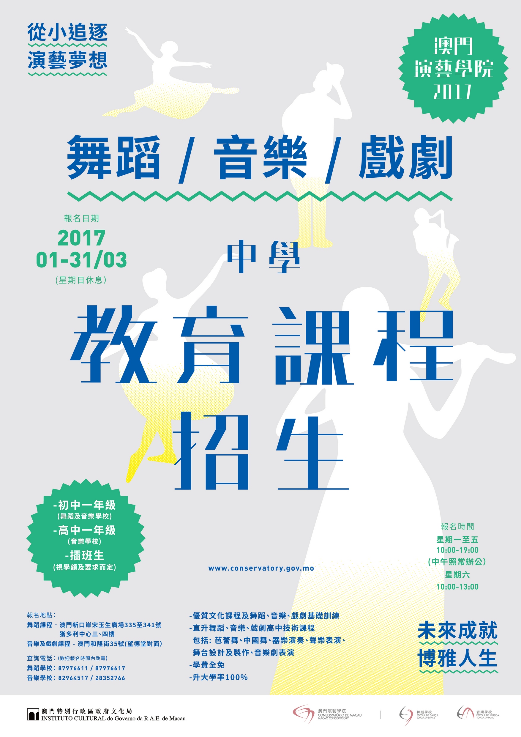 文化局澳門演藝學院二零一七/一八學年將於三月一日至三月三十一日招生,屬下舞蹈學校將招收初一新生,音樂學校將招收初一、高一新生,同時,各校還會根據現有的學額招收部分符合要求的插班生,歡迎對表演藝術擁有濃厚興趣的學生報名。