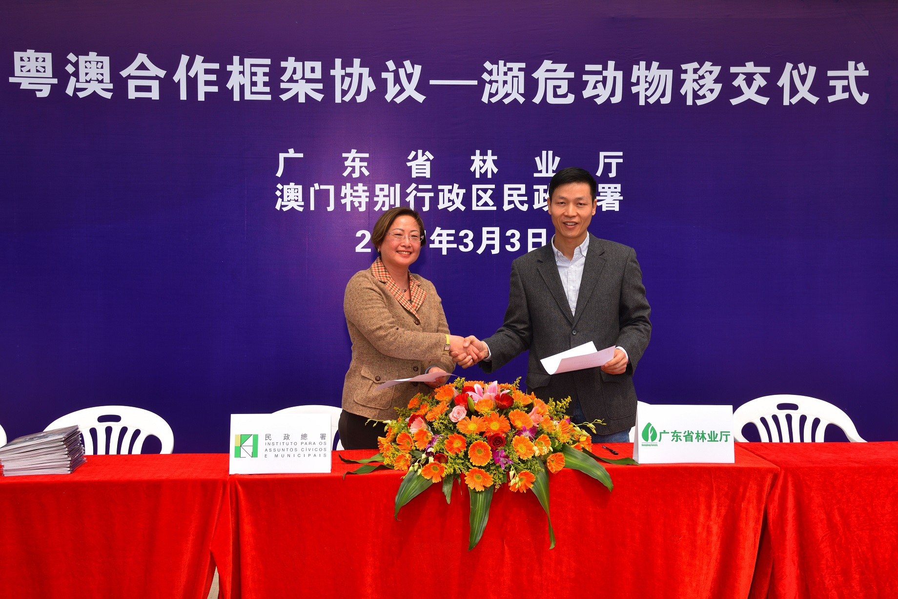 為貫徹落實《粵澳合作框架協定》,建立粵澳環境綠化及瀕危動植物鑒別方面的交流合作機制,加強粵澳瀕危野生動植物保護與合作交流,共同打擊瀕危野生動植物貿易違法行為,民政總署與廣東省林業廳於二○一五年簽訂了《粵澳瀕危動植物鑒別交流合作機制框架協議》。