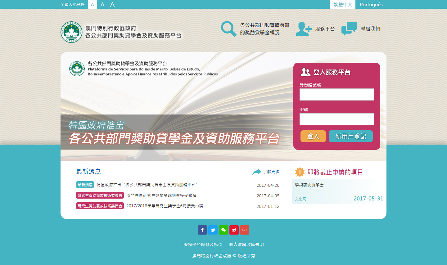 高等教育輔助辦公室於4月20日推出“澳門特別行政區政府各公共部門奬助貸學金及資助服務平台”(https://www.bolsas.gov.mo,下稱“服務平台”),以協助市民全面瞭解和獲取不同公共部門在高等教育領域所提供的各類獎、助、貸學金的資訊;同時,透過共享服務平台,有助相關公共部門掌握整體的申請狀況,使公共資源的運用更為合理。