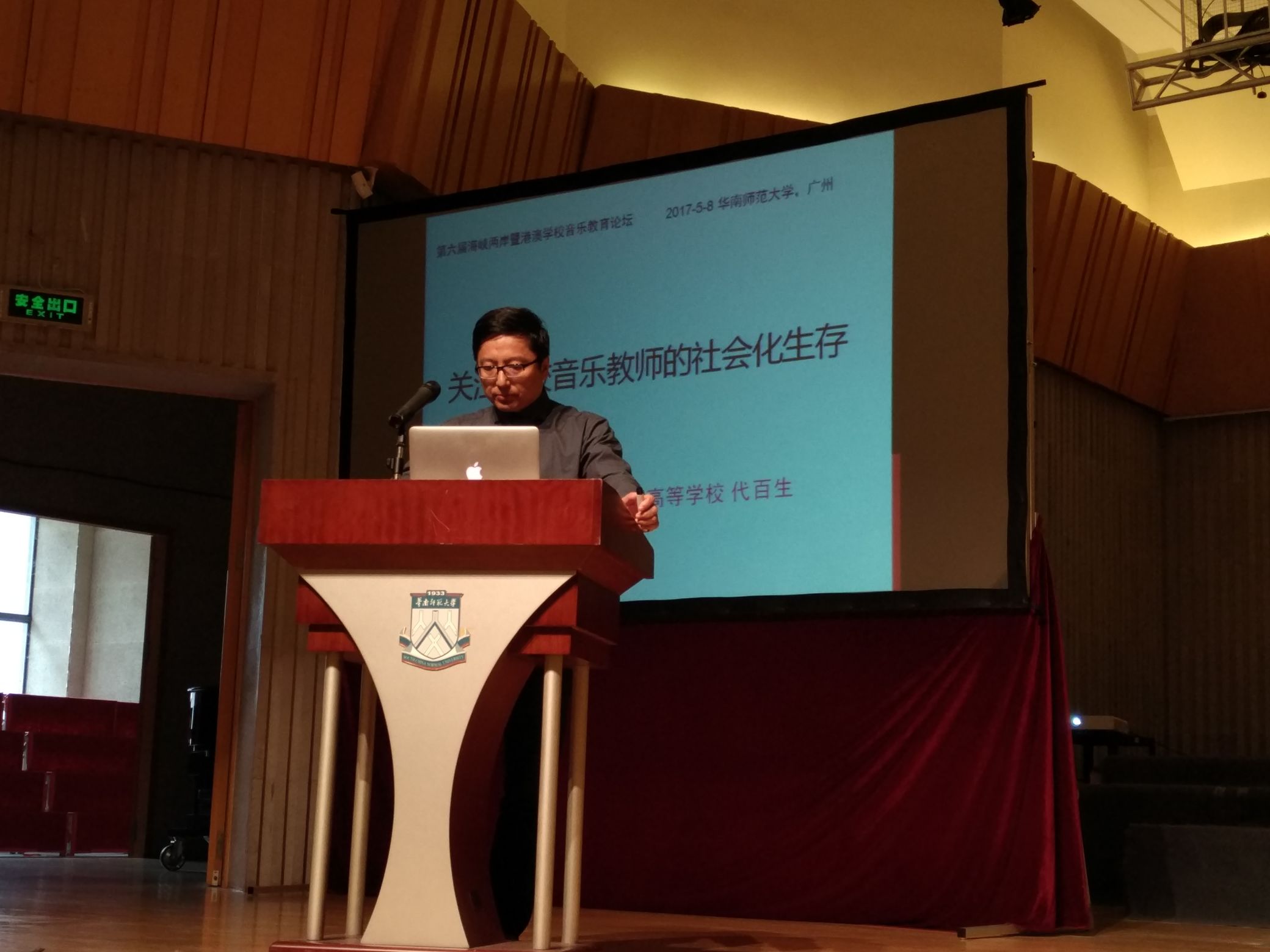 作為論壇創辦人之一以及資深音樂教育學者,澳門理工學院藝術高等學校音樂課程主任代百生副教授在主席台就坐,並作主題發言《關注學校音樂教師的社會化生存》。發言分為三個部份:從教育社會學角度考察學校教師“職業”的社會生存狀況,以此作為理論基礎;特別關注與分析了作為學校教師的“小眾群體”的音樂教師“社會化生存”的尷尬狀況;在最後重點提出了破解學校音樂教師社會生存壓力與困境的若干建議,在其中特別介紹了澳門理工學院音樂課程在改革與發展中的舉措,包括聘請國際學術權威作為“校外考試委員”協助審核教學大綱與考試資料,嚴把教學學術質量關;成立“校外咨詢委員會”及時了解社會對音樂人才的能力需求,為課程改革與教學調整搜集信息;建立畢業系友資料庫跟蹤了解畢業生工作狀況並及時介紹學院動態,並樹立對畢業生的“產品跟蹤服務意識”;倡導“為教而學勝過為學而學”的教與學新觀念等。發言總結到:“以社會平等”這一社會學學科之眼來審視教育,所看到的便是影響著教育、發生在教育過程及受制于教育的各種各樣的平等問題。學校音樂教師這一職業群體在學校教育工作中已經或正在經歷著一些“不平等”,急需依靠教育制度保障、學校文化建設以及音樂教師本身的心理調適來加以改進。學校音樂教師的“社會地位”與“教育權威”從何而來又殘存幾許?其“作為教師的人”與“作為人的教師”的雙重角色轉換是否順利?其職業社會化前景如何等等這些問題是影響學校音樂教師工作成效的重要因素與深層動機,需要引起教育管理者、音樂教育研究者、學校音樂教師從業者乃至全社會的關注。代百生副教授的主題發言引起參會的各級學校音樂教師的共鳴,討論熱烈。
