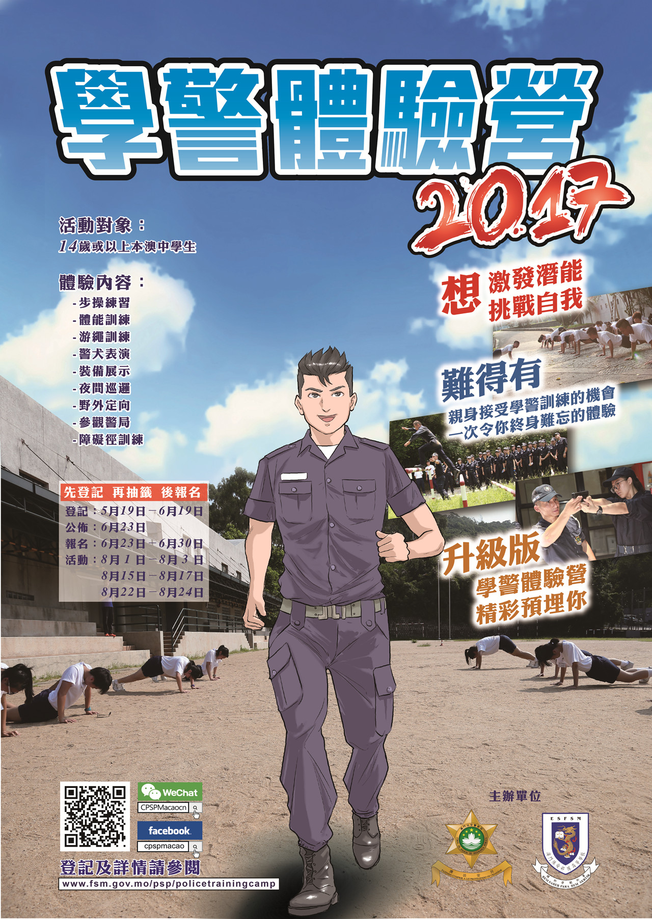 本局繼去年暑假首次舉辦「學警體驗營2016」活動,廣受青少年歡迎,今年再接再厲,與澳門保安部隊高等學校合作舉辦「學警體驗營2017」。活動目的為加深青少年對警察工作的認識,樹立正確價值觀,培養自覺性及紀律性,善用餘暇增值自己。活動內容較去年更為豐富,將增添更多特別體驗元素,屆時並安排參加者入住保安部隊之訓練基地,體驗學警的訓練項目,讓青少年實地體驗學警之訓練生活。
