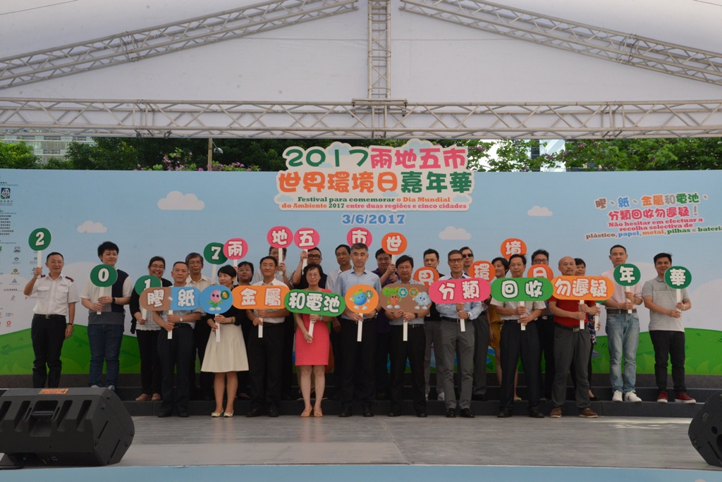由環境保護局主辦的“2017兩地五市世界環境日嘉年華”今日(6月3日)下午假友誼廣場舉行,活動圍繞“膠、紙、金屬和電池,分類回收勿遲疑”為主題,凝聚社會各界共同推動“源頭減廢,分類回收”工作。