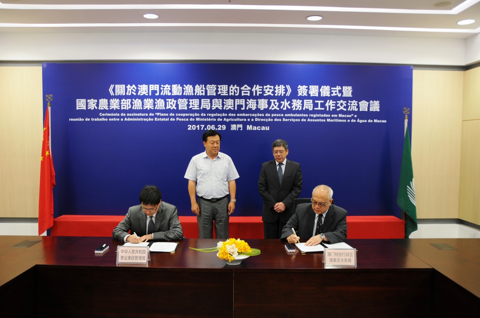 在國家農業部副部長于康震及澳門運輸工務司司長羅立文的見證下,國家農業部漁業漁政管理局副局長劉新中及澳門海事及水務局代局長曹賜德代表兩地簽署《關於澳門流動漁船管理的合作安排》。《合作安排》的簽署,標誌著雙方同意就涉及澳門流動漁船漁民的發展和管理方面,尤其在漁業發展、漁業漁政管理、澳門流動漁船管理和遠洋漁業發展以及漁業資源環境保護等方面,開展進一步的交流與合作。爲有效實施各項合作活動,雙方建立定期會晤和聯絡員制度。