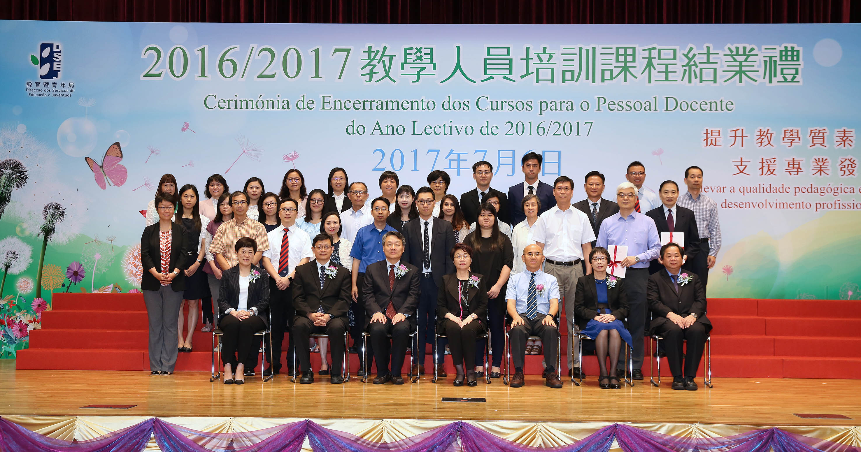 為了與教學人員共同分享完成培訓的碩果與喜悅,同時藉此鼓勵教學人員持續進修,為教育質素不斷的提升作出貢獻,教青局於7月6日下午假座鏡平學校(小學部)禮堂隆重舉行了“2016/2017學年教學人員培訓課程結業禮”。教青局局長梁勵、中央人民政府駐澳門特別行政區聯絡辦公室文化教育部副部長級助理邵彬、教青局副局長老柏生和郭小麗、澳門大學教育學院院長范息濤、澳門中華教育會理事長陳虹、澳門天主教學校聯會理事長黃彪,以及培訓機構的代表及導師、各校校長及參加培訓課程的300多名教學人員出席了典禮。