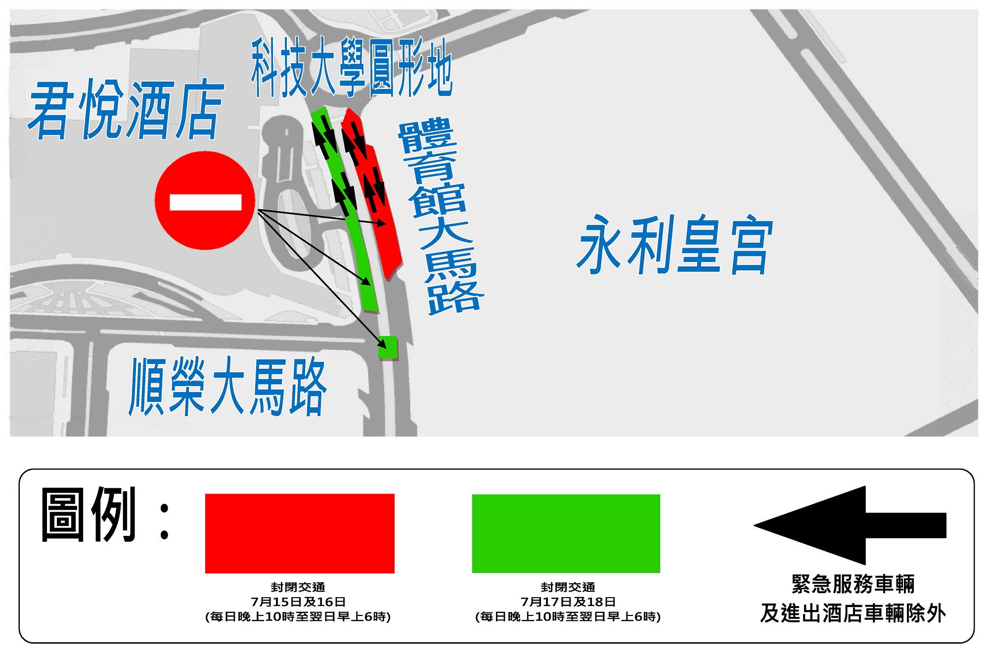 7月15日(周六)及16日(周日)每日晚上10時至翌日凌晨6時,氹仔體育館大馬路近永利皇宫酒店的路段(往澳門東亞運動會體育館方向)封閉交通,而近科技大學圓形地的路段實施雙向行車,50(往路環市區)、MT4(往關閘總站)及N5(往蝴蝶谷大馬路總站)路線需改道行駛,“體育館馬路/永利皇宮”站暫停使用。