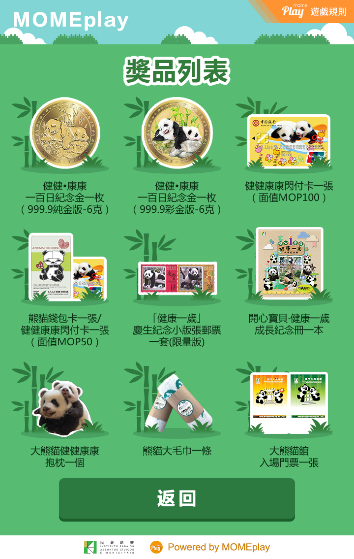 參加遊戲幸運中獎者,手機會出現中獎提示或電子使用券編碼,幸運兒須按兌換規則領取獎品。若獲得大獎金幣之幸運兒,須親臨民署綜合服務中心或北區市民服務中心憑手機顯示之電子禮券登記領獎,領獎日期將由專人通知,得獎人須親臨領獎;而獲得閃付卡及其他紀念品之中獎者,請先致電2847 1366進行查詢及登記,並須自行前往上述服務中心換領,出示並開啟手機程式然後輸入兌換碼換取有關禮品;獲得澳門大熊貓館門票,須透過全澳三十五台城市指南資訊亭輸入兌換碼並列印使用券,憑使用券可於大熊貓館售票處換領正式門票入場。