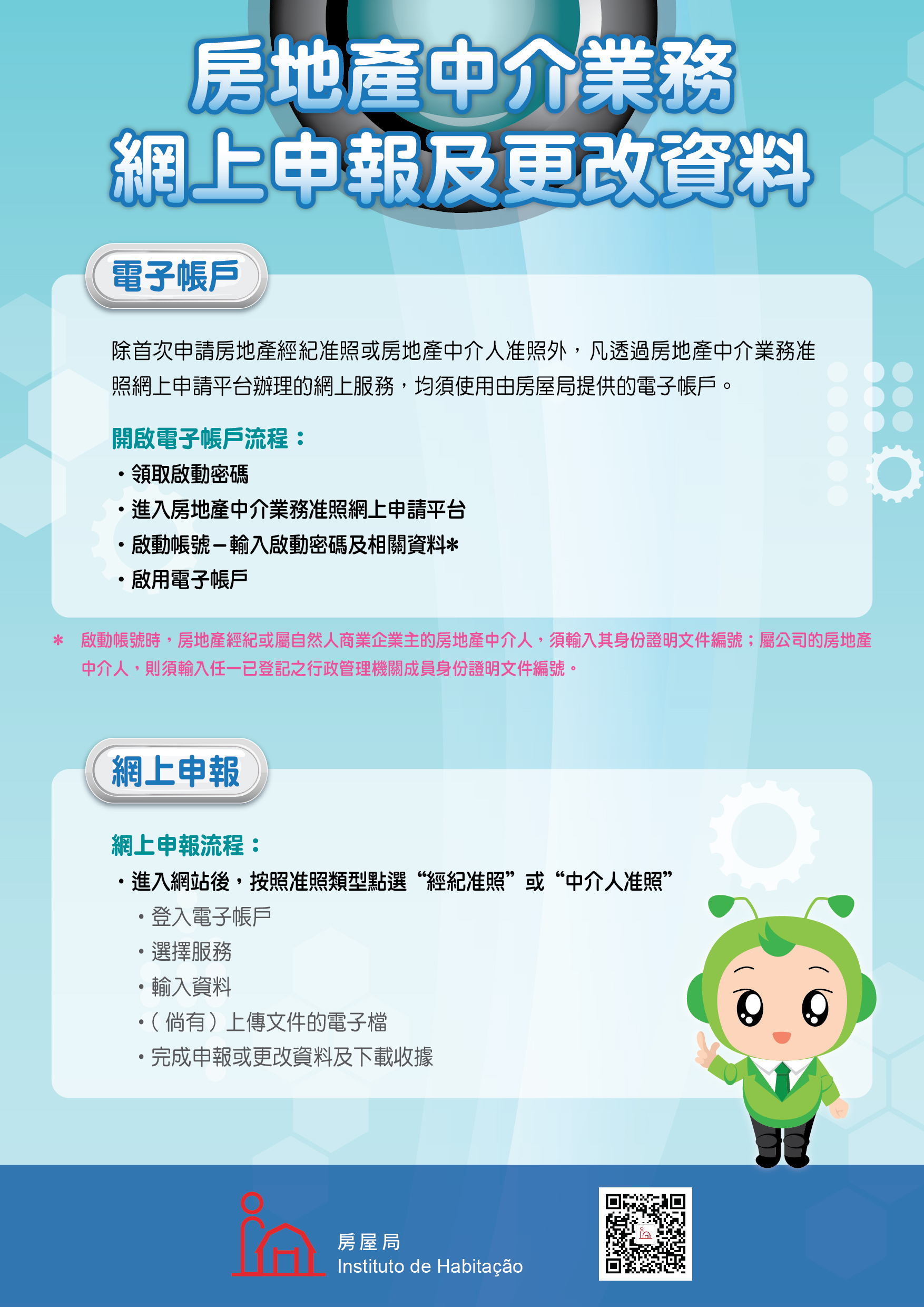 此外,房屋局今(14)日起正式啓用房地產中介業務一般事項的網上申報及更改資料服務,並正在分批向持有效准照的房地產經紀及房地產中介人寄出電子帳戶啓動密碼,以配合服務使用。