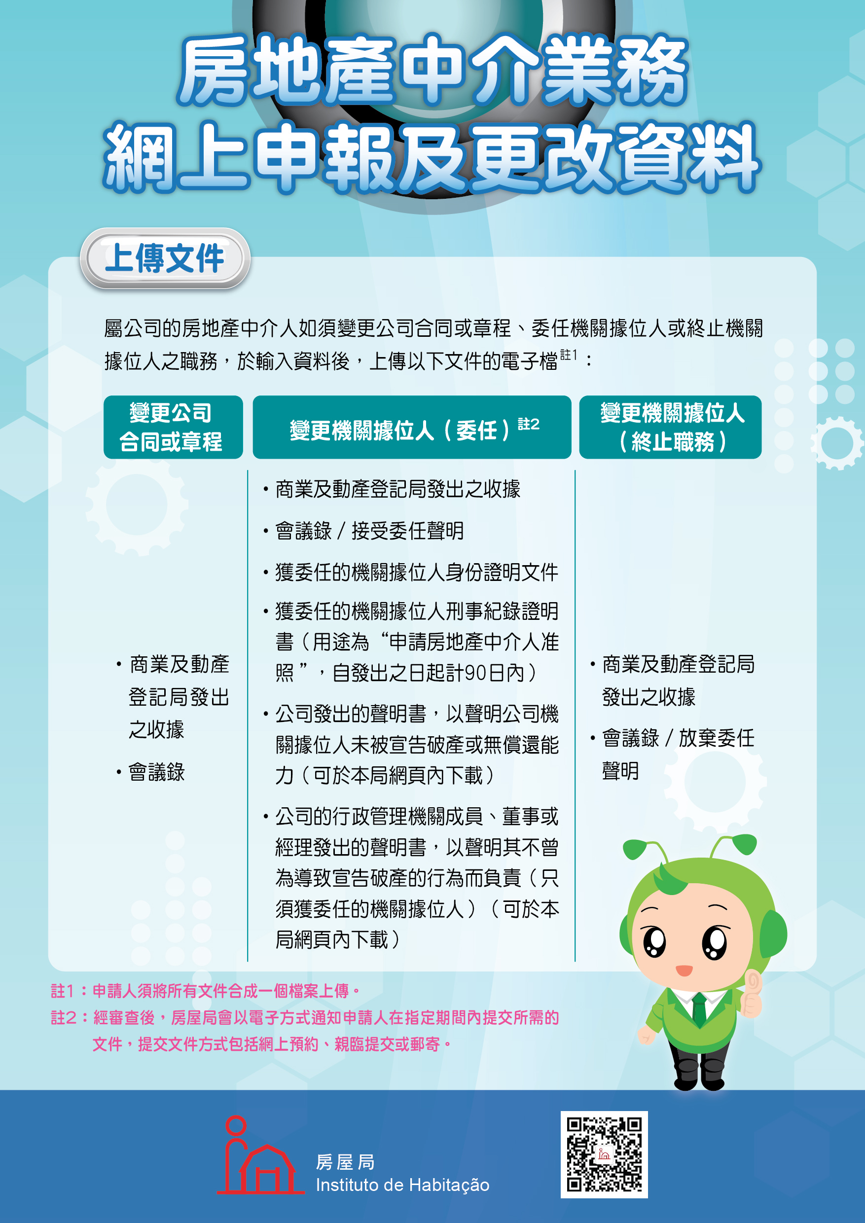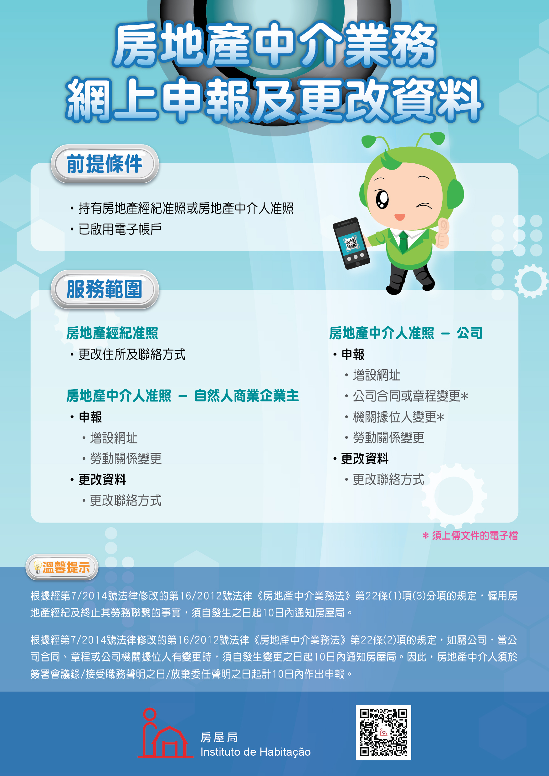 是次新增的網上申報及更改資料服務包括:房地產經紀准照更改住所及聯絡方式;房地產中介人准照(自然人商業企業主)申報增設網址、勞動關係變更通知,以及更改聯絡方式;房地產中介人准照(公司)申報增設網址、公司合同或章程變更、機關據位人變更通知、勞動關係變更通知,以及更改聯絡方式。